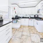 Double glazed window to rear. Double glazed door to side. Range of base and wall mounted units providing drawer and cupboard space with work top surface extending to incorporate inset sink unit. Recess for range style cooker and fridge freezer. Tiling to floor and surround. Downlighters to ceiling.