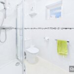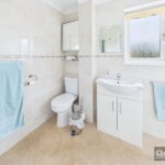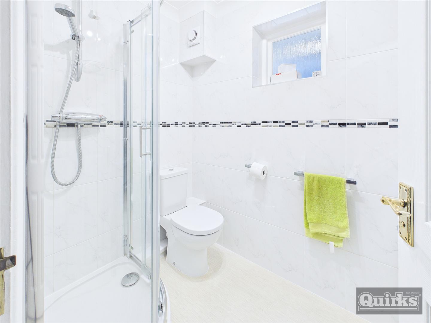 Double glazed window, tiled walls, three piece suite in white comprising shower cubicle, low flush wc, wash hand basin inset to vanity cupboard, radiator