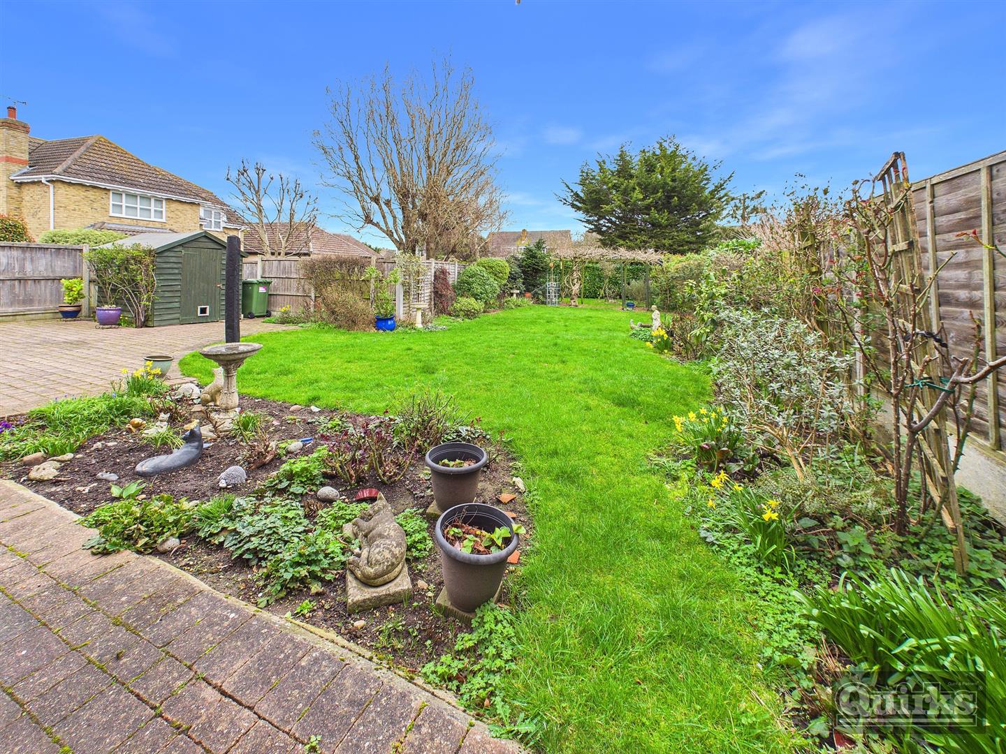 Large garden for the area, large patio area, large lawn pergola, mature flowers and shrubs fenced to all boundaries, side access to front, shed, personal door to garage
