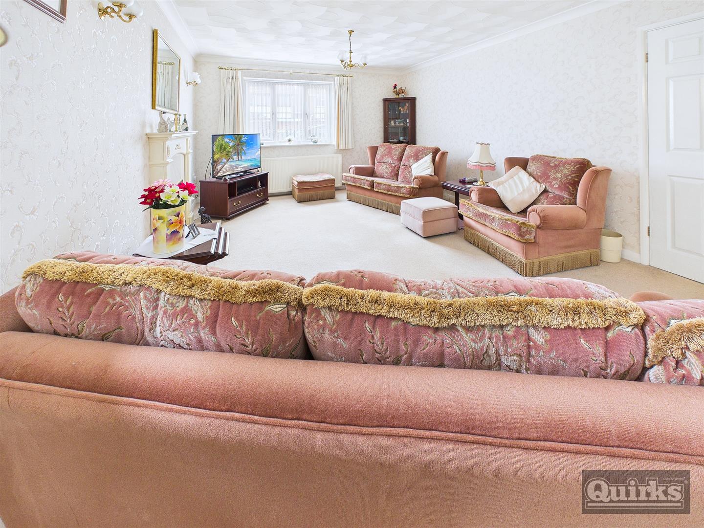 Double glazed window to front, French type internal doors to DINING ROOM, two radiators, decorative fire surround with inset electric fire, coved ceiling
