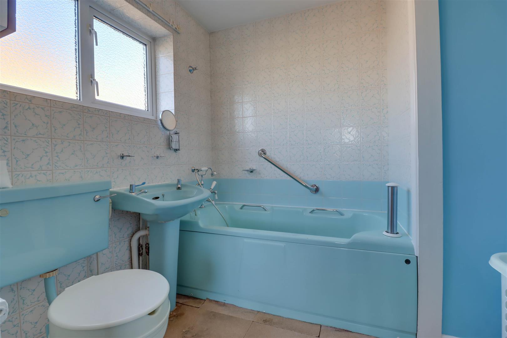 Part glazed opaque window to side. Suite comprising of low level WC, pedestal wash hand basin and panel enclosed bath unit. Extensive tiled surround.