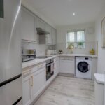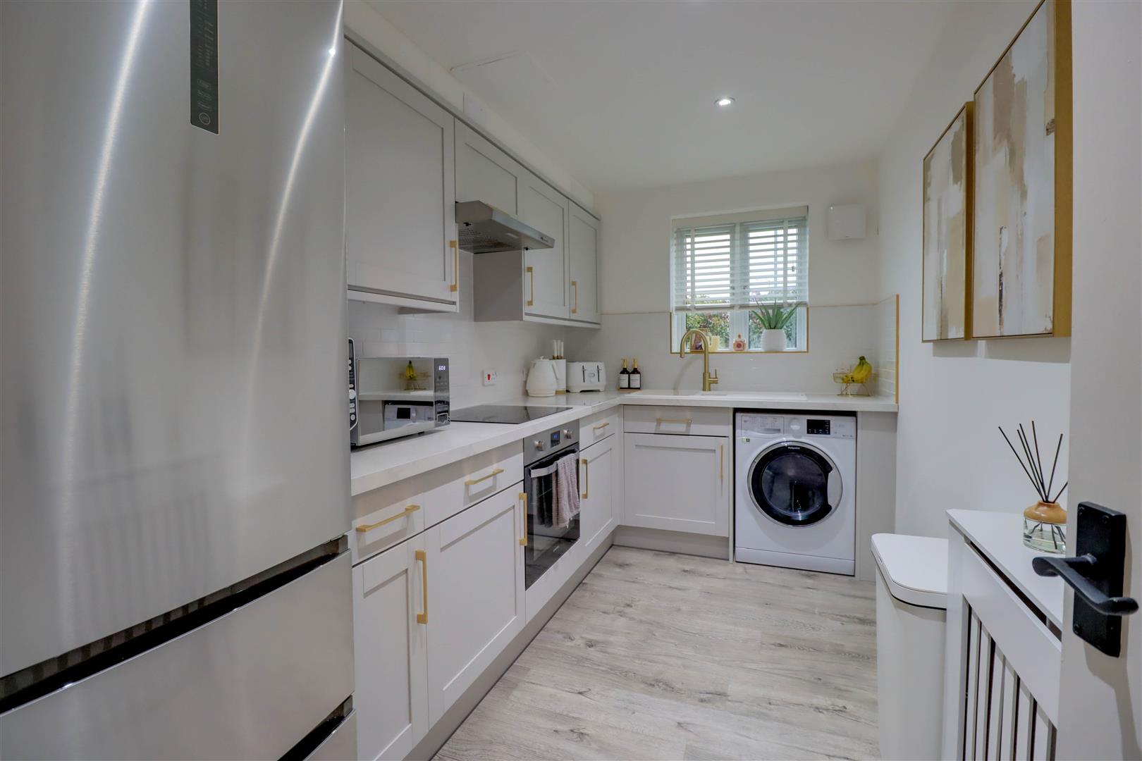 Double glazed window to front. Radiator in casement surround. Range of recently refitted base and wall mounted units providing drawer and cupboard space with work top surface extending to incorporate inset sink unit. Space for fridge freezer and washing machine. Built in oven, hob and extractor fan. Tiled surround.