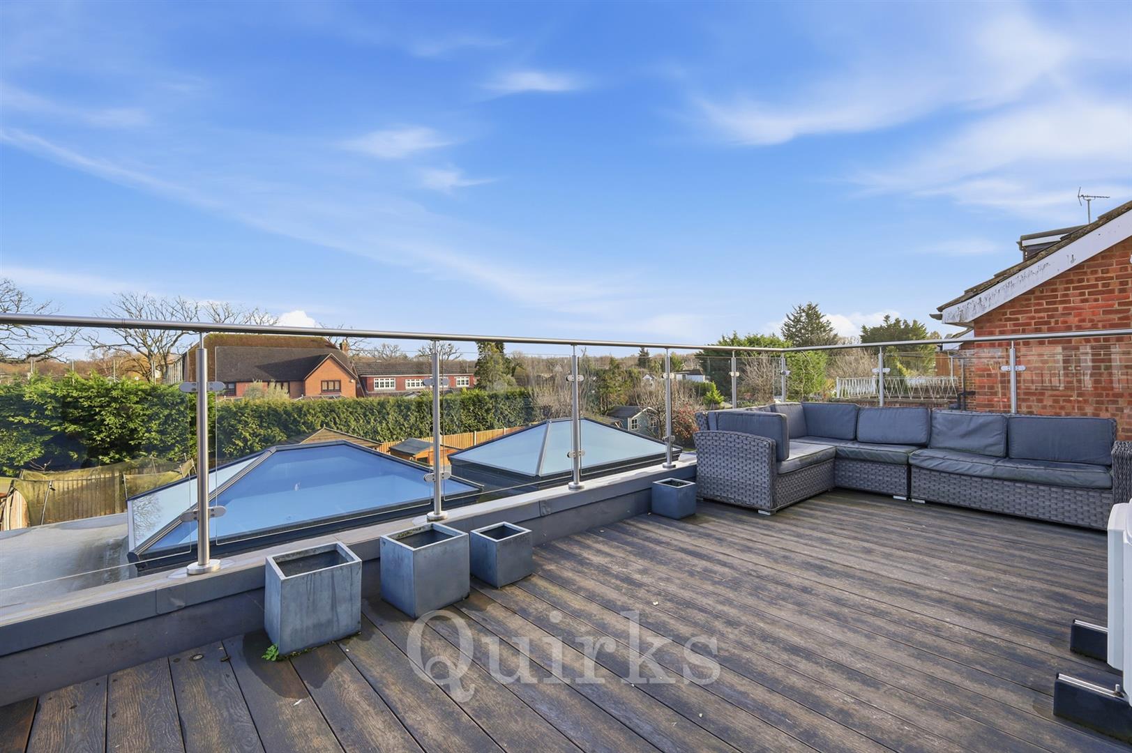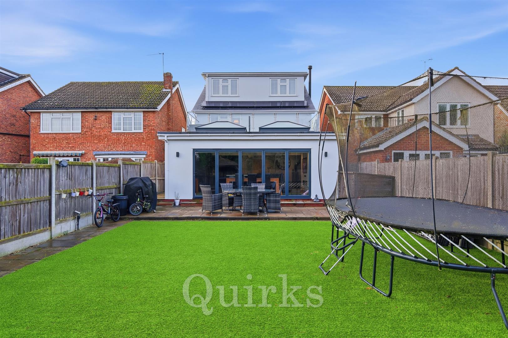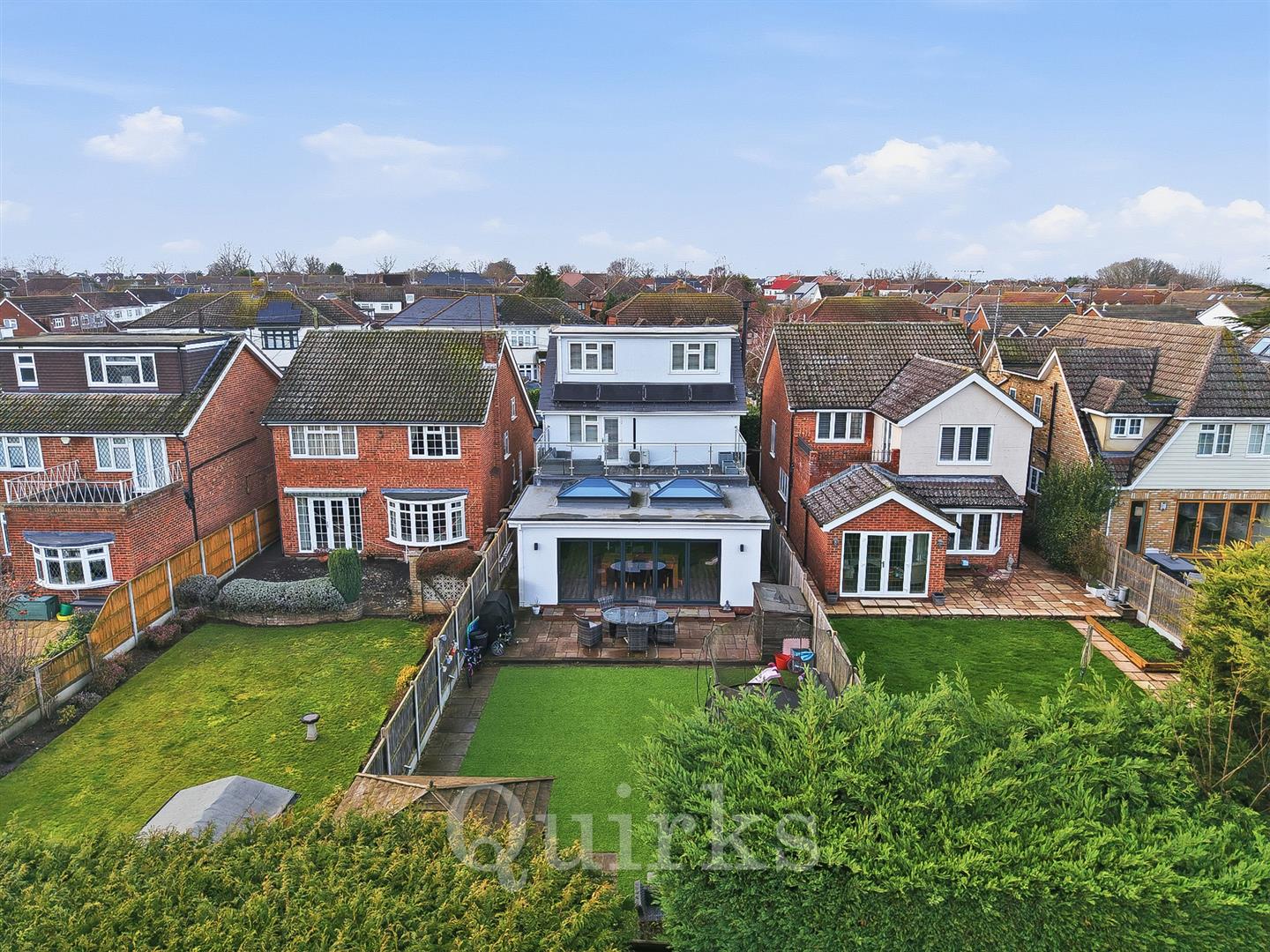 This impressive five bedroom detached family home is situated in a quiet location in North Billericay, within walking distance of Stock Brook Country Club, Buttsbury & Mayflower schools, convenience shops and Lake Meadows Park. This renovated and extended property offers excellent accommodation in excess of 2,000 square feet, set over three floors, including a study, gym / playroom, utility room, ground floor W.C, stunning open plan kitchen / dining / family room, with island / breakfast bar, a range of integrated appliances, wood burning stove, media wall, lantern roof and bi-folding doors to the low maintenance and secluded rear garden. Bedroom one has the advantage of air conditioning and built in wardrobes, leading to a 'Narnia' spacious and modern en-suite shower room, there is also a sun terrace / balcony with glass balustrading, perfectly suited for al fresco dining or a morning coffee overlooking the rear garden. Bedroom two is also a spacious double room with air conditioning unit and built in wardrobe, bedroom three could accommodate a double bed if required. The family bathroom has a four piece suite including a paneled bath with shower attachment and also a separate shower cubicle, with a fully tiled and modern white suite. The second floor landing has access to eaves storage space and a modern shower room serving two further double bedrooms, this floor is well suited as an annex, with the fifth bedroom used as an additional living room. Externally there are solar panels to the front and rear aspects of the roof space, making this an energy efficient home, the property also has extensive driveway space for several vehicles and side gate access to the rear garden, please note the Jacuzzi hot tub is available by negotiation.