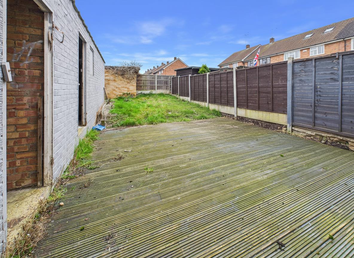 Decked area, remainder laid to lawn, two brick built sheds, side access to front, fenced to all boundaries, westerly aspect