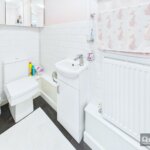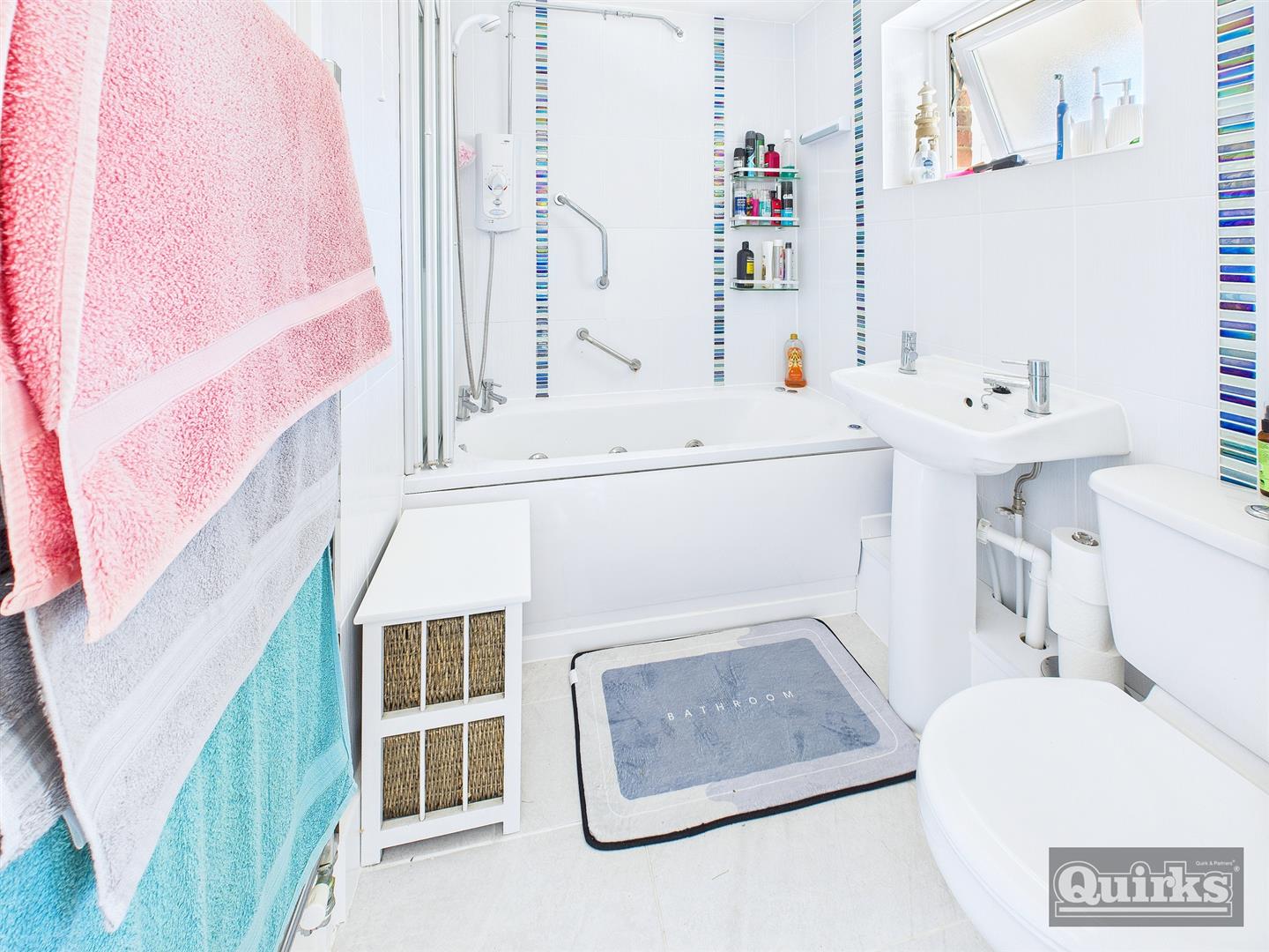 Double glazed window to front, three piece suite comprising panelled JACUZZI bath with screen and electric shower, heated towel rail, tiling to floor and walls