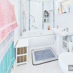 Low flush wc and wash hand basin inset to vanity unit, radiator, part tiled