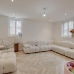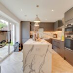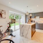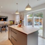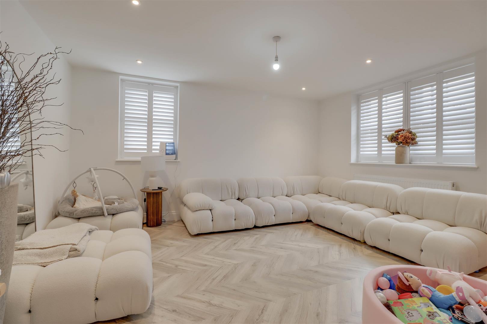 Double glazed Bi-folding doors and sash window to rear. Radiator. Range of base and wall mounted units providing drawer and cupboard space with work top surface extending to incorporate inset sink unit with cupboard beneath. Island unit with cupboard beneath. Built in double oven, induction hob and extractor fan above. Integrated dishwasher, fridge freezer and washer dryer. Downlighters to ceiling.