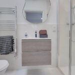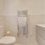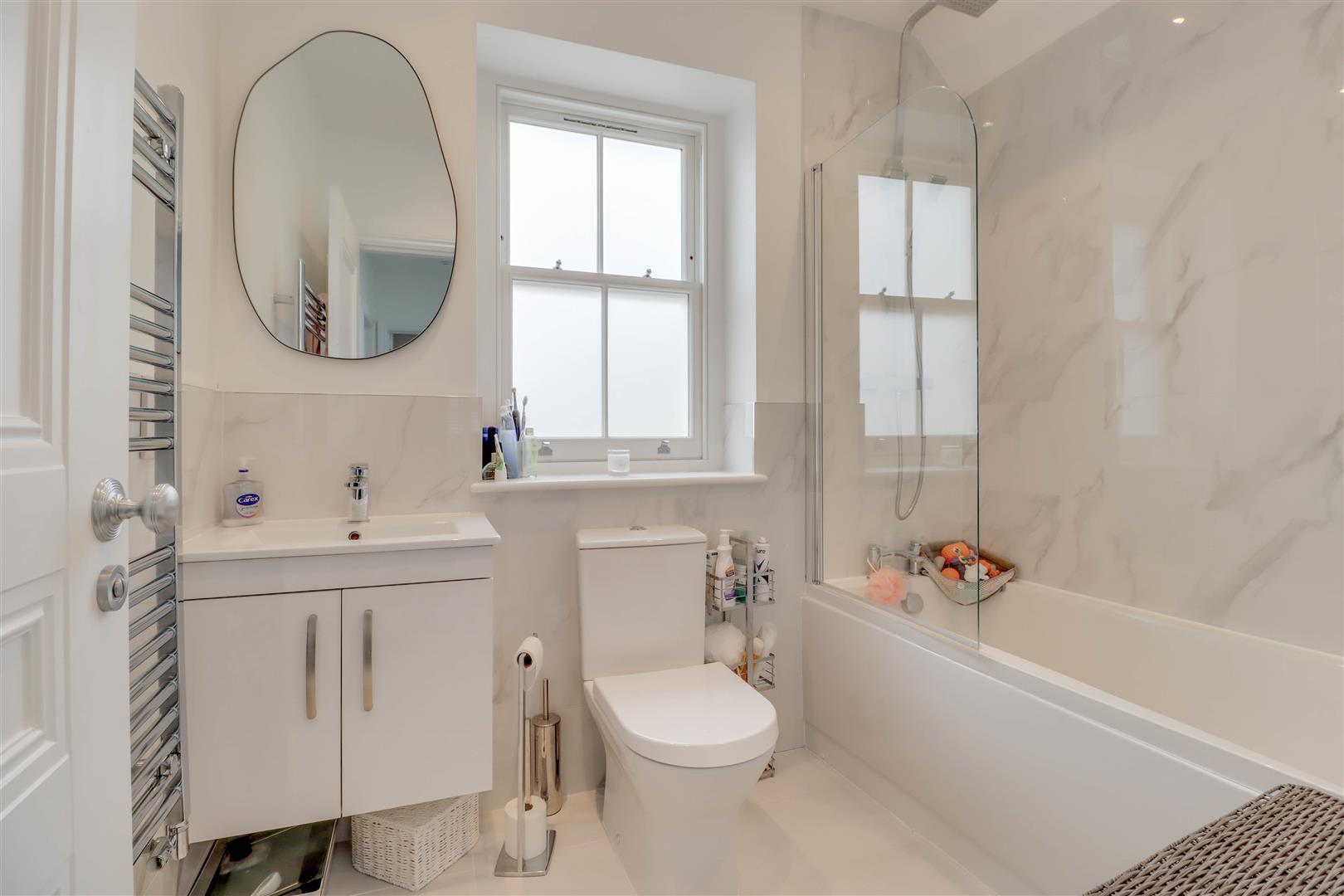 Double glazed sash window to front. Suite comprising of low level WC and vanity wash hand basin. Tiling to floor and surround. Radiator/rail. Downlighters to ceiling. Extractor fan.