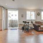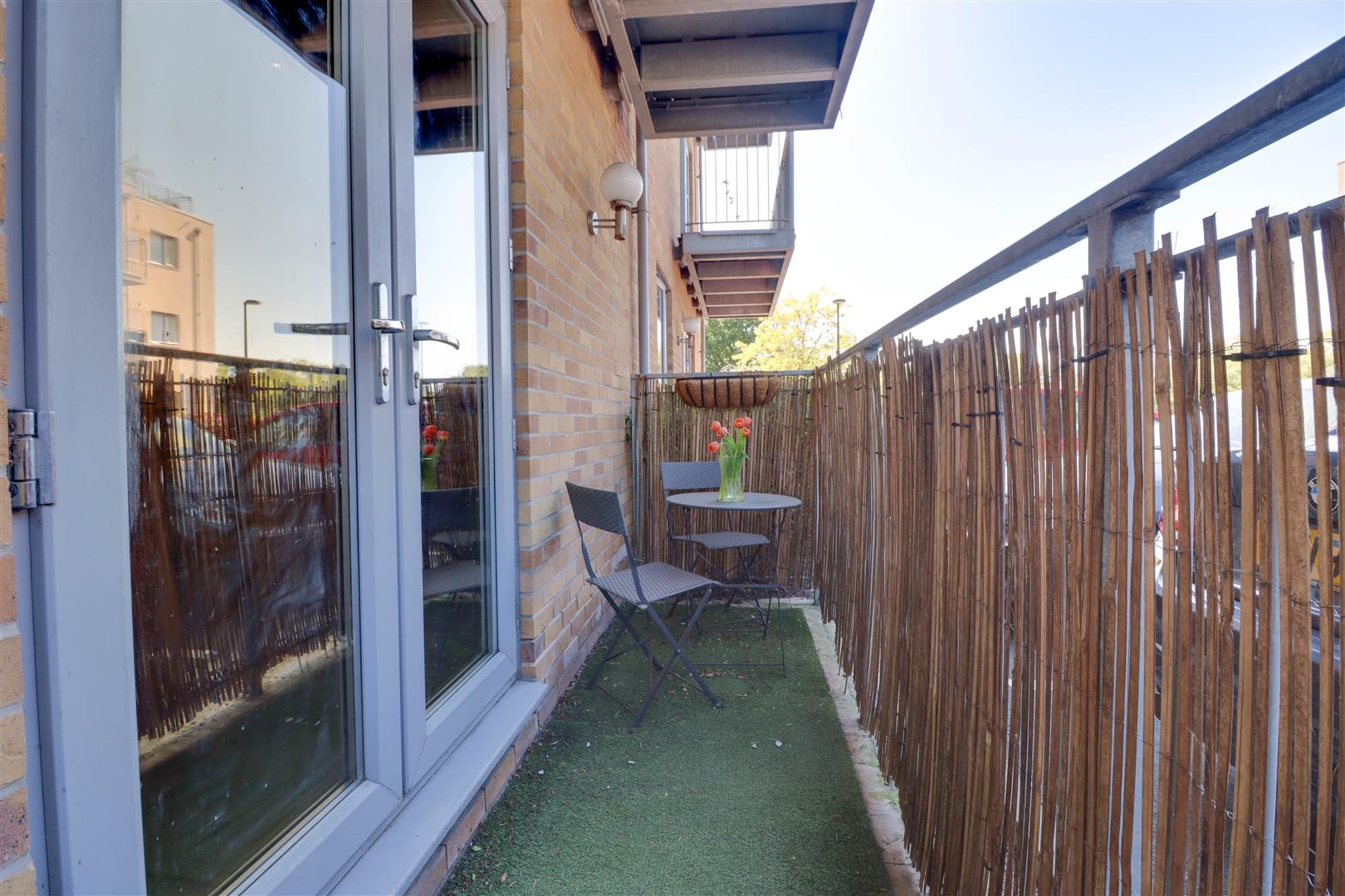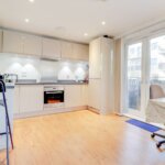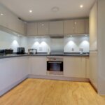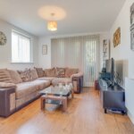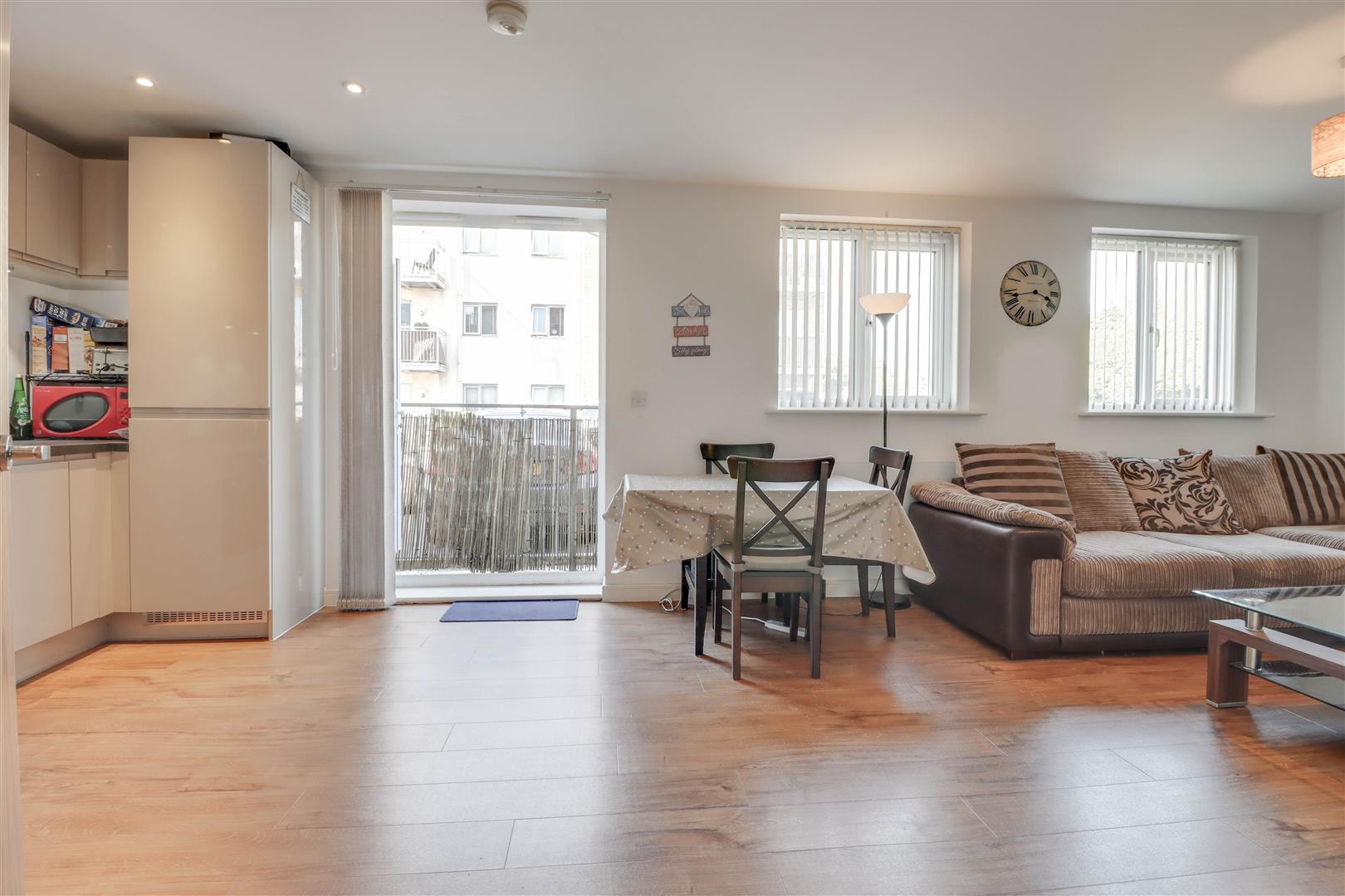 Dual aspect double glazed windows smooth ceiling with inset down lights, laminate flooring, Fitted work surfaces to two walls with range of cupboards below. Inset sink. Ceramic hob and splash screen with cooker hood over and fitted oven, integrated fridge and freezer to remain. (Appliances un-tested) Range of wall mounted cupboards. Double glazed French doors to: