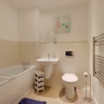 White suite comprising low level WC with concealed flush, wash basin and panel bath. Smooth ceiling with inset down lights, heated chrome effect towel rail (Not tested) extractor fan, part tiled to two walls.