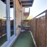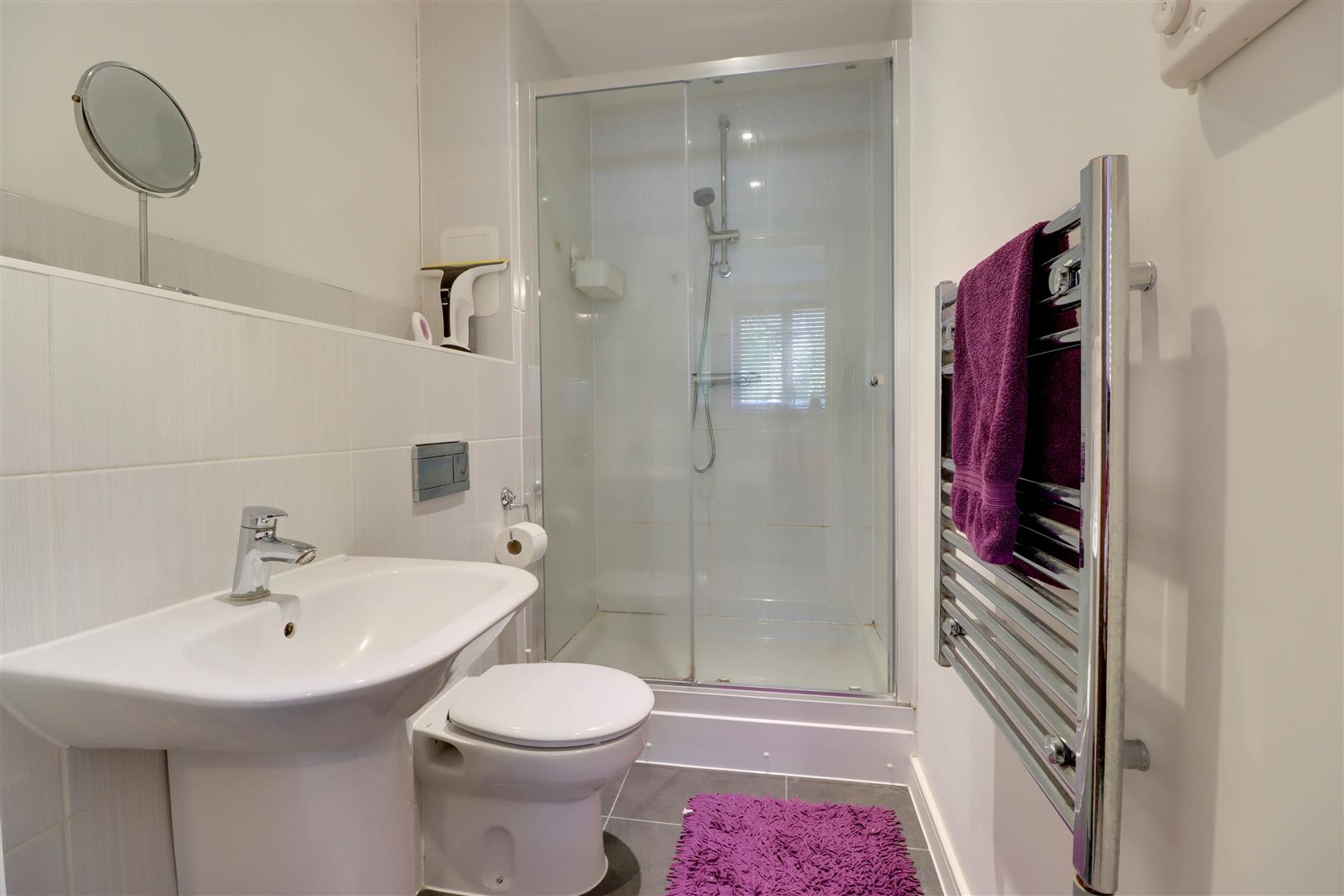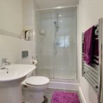Modern suite comprising low level WC with concealed flush, wash basin and shower cubicle with sliding splash doors. Part tiled walls. Crome effect heated towel rail (Not tested) smooth ceiling, part tiled walls, extractor fan.
