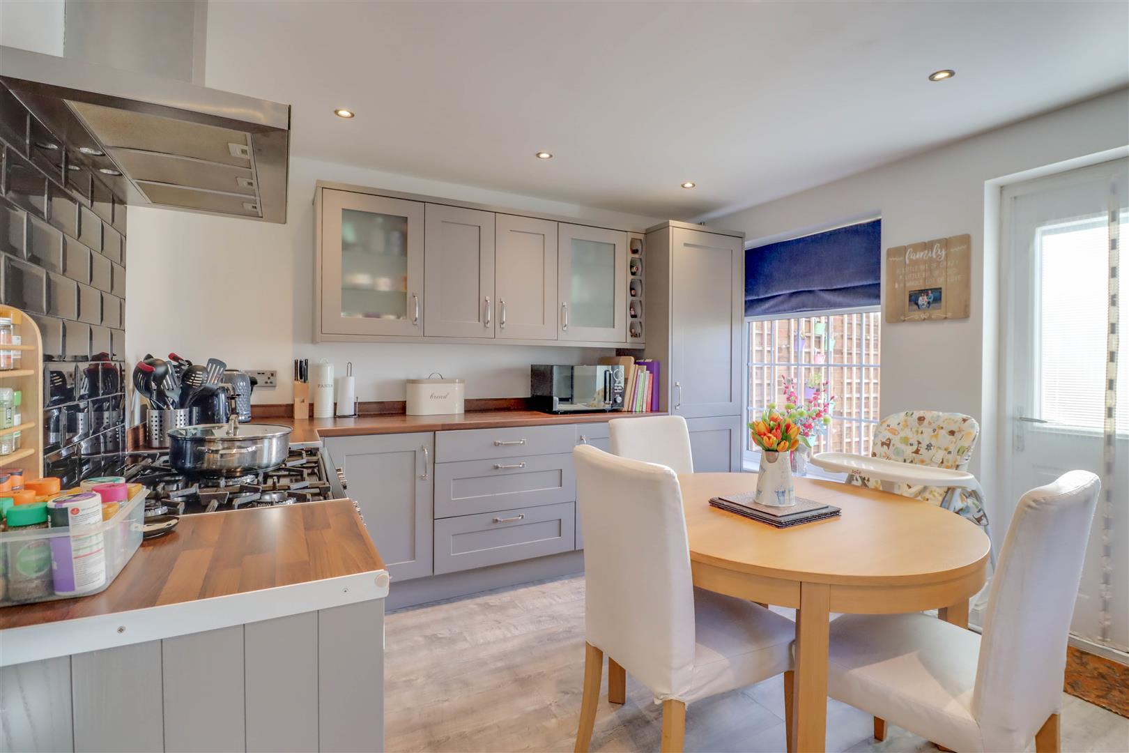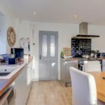 Double glazed windows to rear and side. Double glazed door to garden. Range of base and wall units providing drawer and cupboard space. Roll top work surfaces incorporating inset sink with wine rack and wine fridge. Space for range cooker with extractor above. Recess for washing machine and fridge/freezer and integrated dishwasher. Downlighters to ceiling. Radiator.