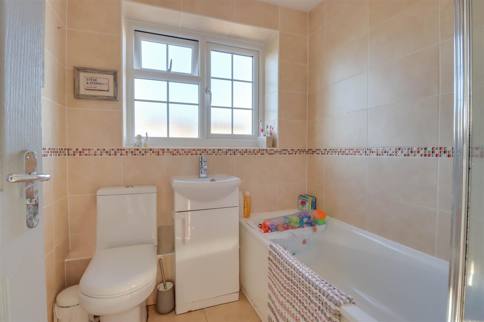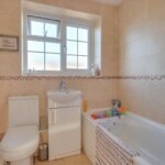 Double glazed window to side. Updated suite comprising of low level W.C., vanity wash hand basin and panel enclosed bath unit. Extensive tiling to walls. Radiator/rail.
