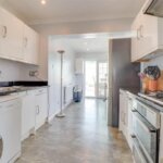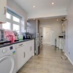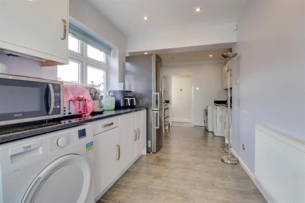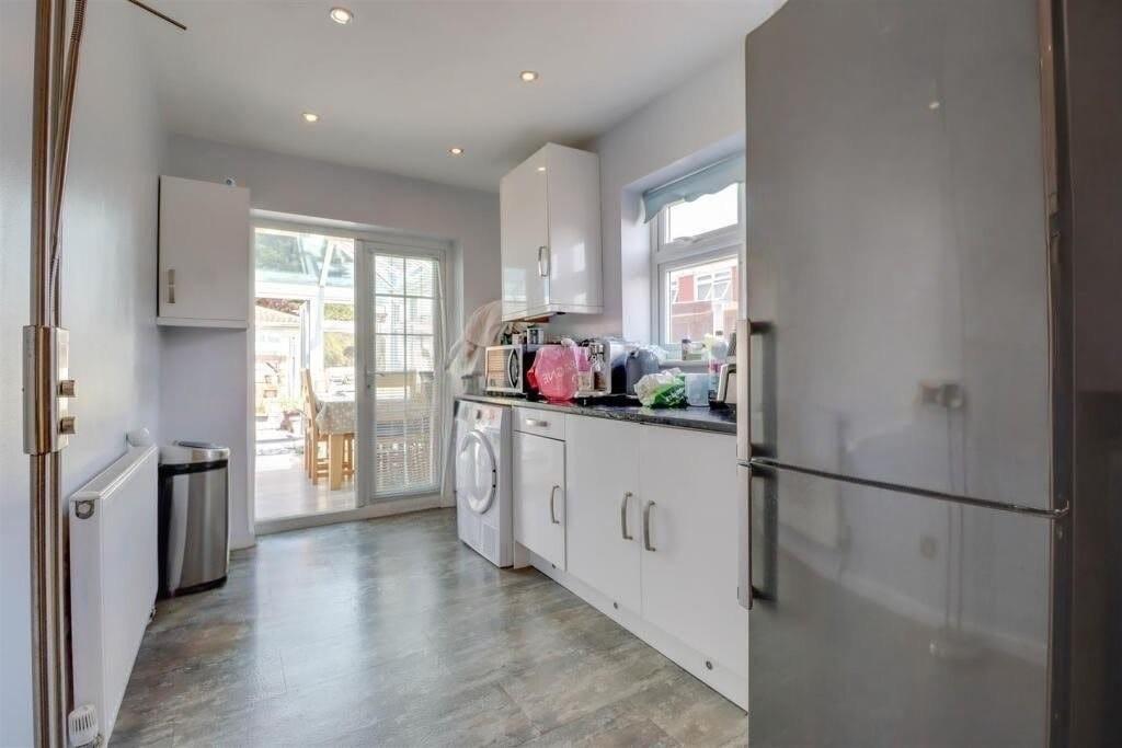 Range of base and wall mounted units providing drawer and cupboard space with work top surface extending to incorporate inset sink unit with cupboard beneath. Double oven, hob and extractor fan above. Recess for washing machine, tumble dryer, dishwasher and wide recess for fridge freezer. Radiator. Downlighters to ceiling. Coved ceiling with downlighters. Double glazed French doors to: