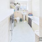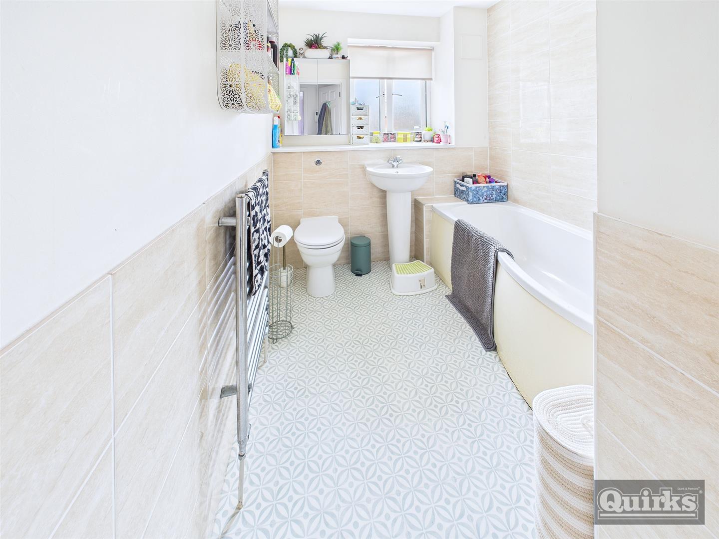 Double glazed window, radiator, modern three piece suite comprising P shaped panelled bath with screen and shower over, Pedestal wash hand basin, low flush wc, heated towel rail, part tiled
