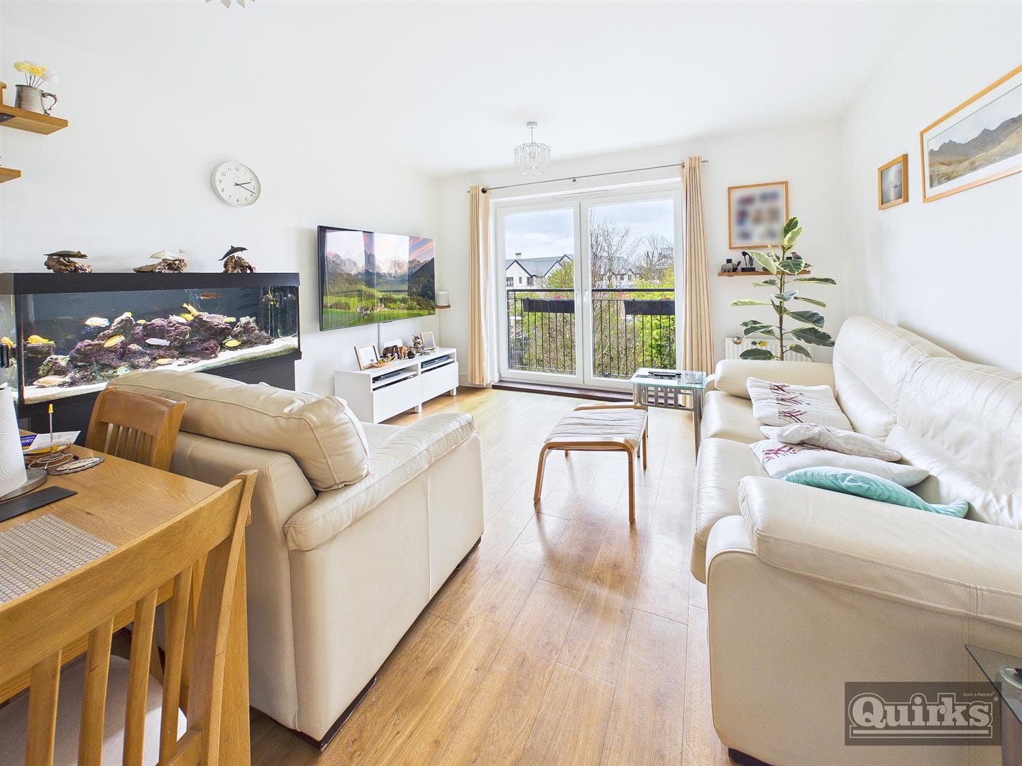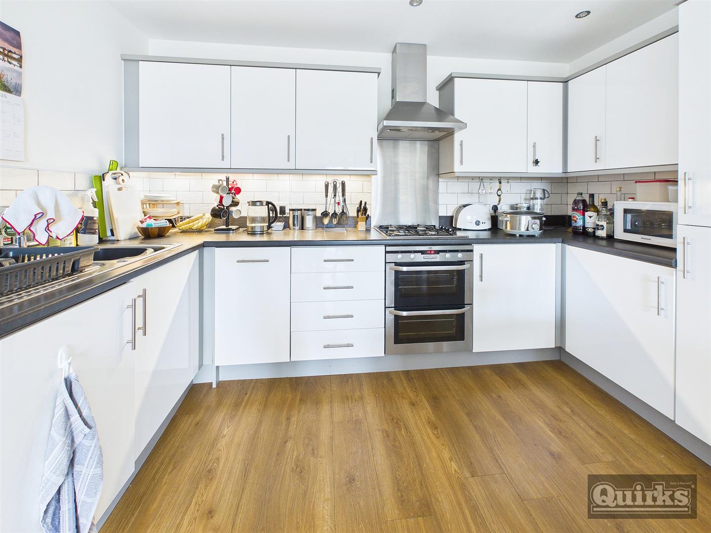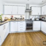 Double glazed doors to SUN BALCONY, wood effect floor covering, radiator x 2, Extensive range of units to both ground and eye level with complimentary roll edged work surfaces, inset sink with drainer and mixer taps, tiled splash backs, under unit lighting, integrated appliances including OVEN, HOB, COOKER HOOD with STAINLESS STEEL SPLASHBACK, DISHWASHER, FRIDGE/FREEZER and WASHING MACHINE
