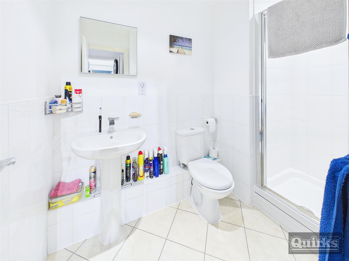 Shower cubicle, pedestal wash hand basin, low flush wc, radiator, part tiled walls and tiled floor, extractor fan