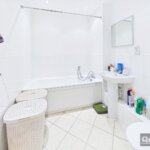 Three piece suite in white comprising pannelled bath with shower tap, pedestal wash hand basin, low flush wc, part tiled walls, tiled floor radiator, extractor fan