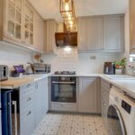 Double glazed window to front. Range of base and wall mounted units providing drawer and cupboard space with work top surfaces extending to incorporate inset sink unit with cupboard beneath. Glazed display cupboards. Built in oven, hob and extractor fan above. Space for fridge freezer and washing machine. Cupboard housing boiler. Tiling to floor and surround.