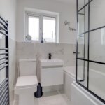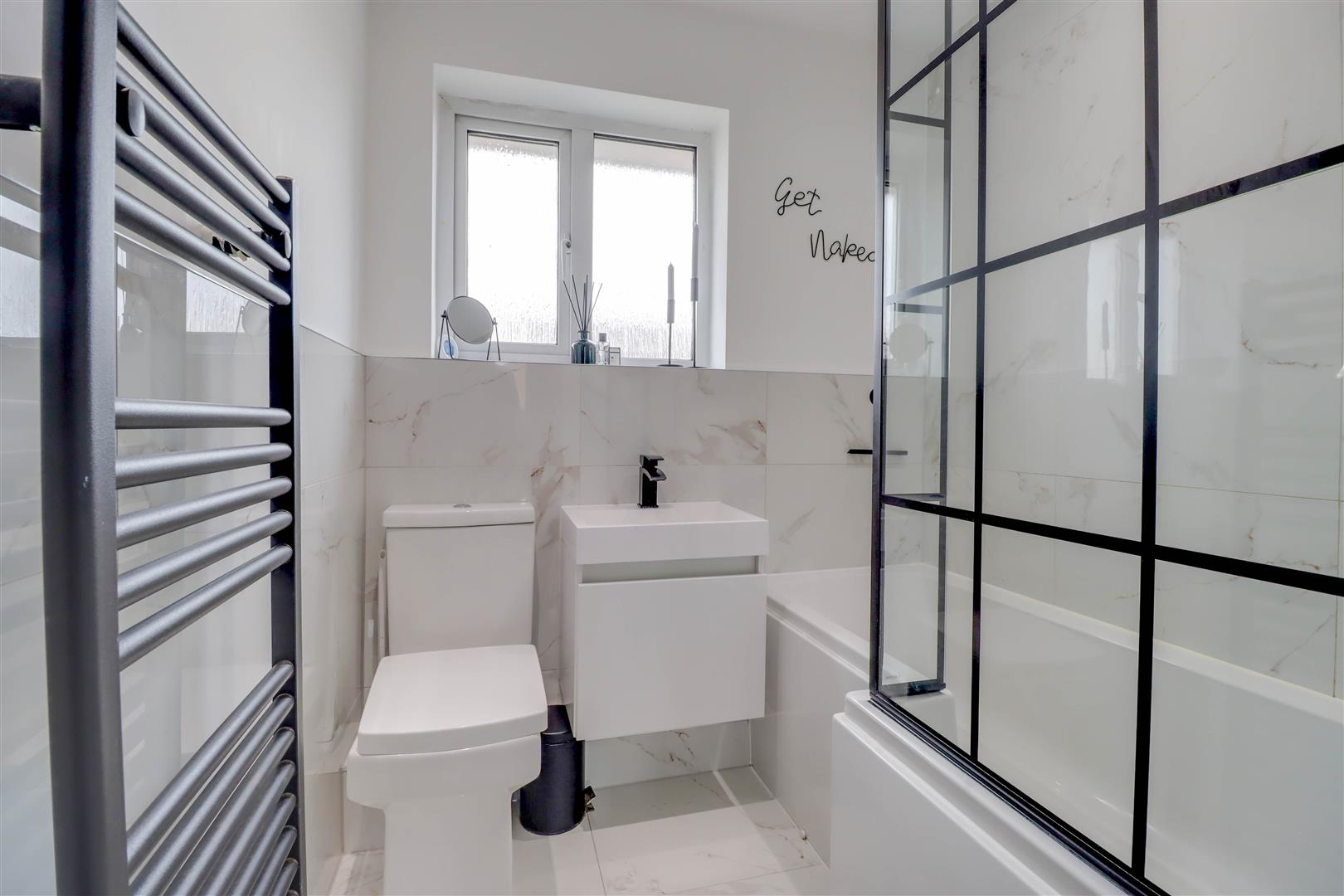 Double glazed opaque window to front. Refitted suite comprising of low level WC, vanity wash hand basin and panel enclosed bath unit with shower and screen. Tiling to floor and surround. Radiator/rail.