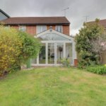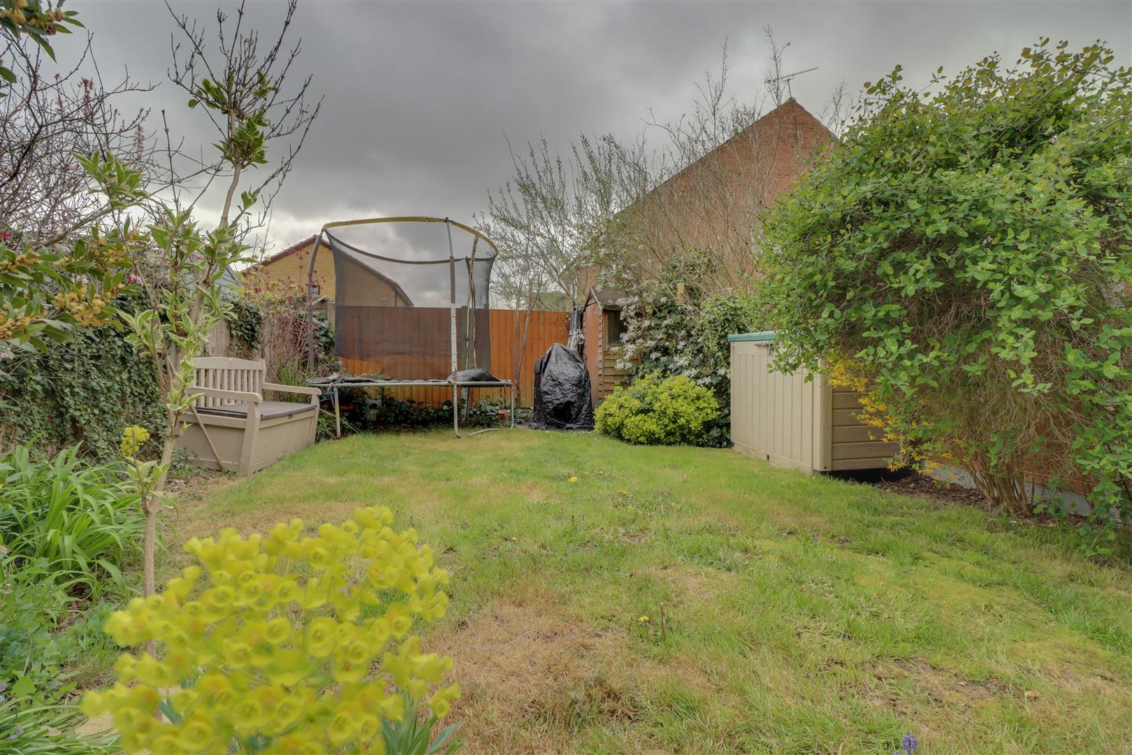 Southerley facing rear garden, mostly lawn, side access to front, flower and shrub borders, shed