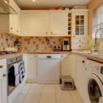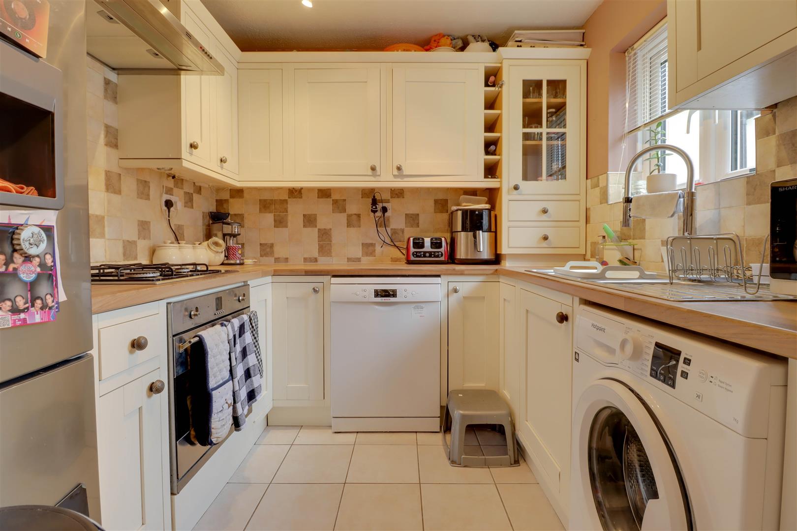 Double glazed window to front, extensive range of units to both ground and eye level incorporating complimentary roll edged work surfaces, Built in oven and hob with cooker hood over, Glass display units, space and plumbing for additional appliance, sink unit with mixer tap and drainer, gas boiler inset to cupboard, ceramic tiled floor and splash back