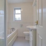 Double glazed opaque window to rear. 4 piece suite comprising of low level WC, vanity wash hand basin, panel enclosed bath unit and shower cubicle. Extensive tiled surround.