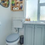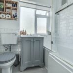 Double glazed opauqe window to rear. Three piece suite comprising of low level WC, vanity wash hand basin and panel enclosed bath unit with shower and screen. Radiator/rail. Tiled surround. Extractor fan.