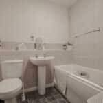 Three piece suite comprising of low level WC, pedestal wash hand basin and panel enclosed bath unit with shower (untested) screen. Radiator (untested). Tiled surround. Shaver point (untested). Extractor fan (untested).