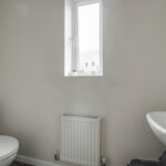 Double glazed opaque window to side. Suite comprising of low level WC and wash hand basin. Radiator (untested).