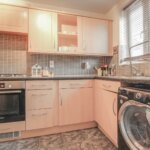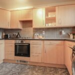 Double glazed window to front. Range of base and wall mounted units providing drawer and cupboard space with work top surface extending to incorporate inset sink unit with cupboard beneath. Recess for fridge freezer and washing machine. Built in oven, hob and extractor fan (untested). Tiling to floor and surround.