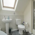 Double glazed Velux style window to rear. Suite comprising of low level WC, pedestal wash hand basin and shower cubicle. Radiator (untested). Tiled surround. Shaver point (untested).