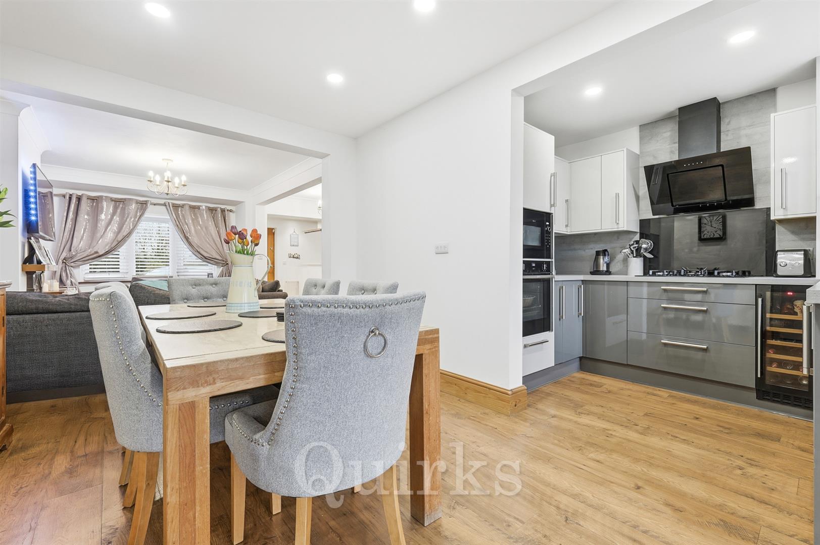 This extended three double bedroom family home, has excellent accommodation set over three floors, including entrance porch and hallway, ground floor W.C, integrated kitchen, with open plan living space, incorporating a living room, dining area and breakfast room with double glazed patio doors, leading to the 90ft South facing rear garden. There are two double bedrooms to the first floor, with refitted family bathroom and study area. The Second floor has an impressive master suite with fitted wardrobes, built-in eaves storage, dual aspect skylight windows with countryside views and a modern, fully tiled en-suite shower room, with double width walk-in shower. This property is set back from the road with ample parking for 3/4 cars, shared driveway access to the garage, there are storage sheds for additional storage space. The popular Great Burstead area has highly rated schools nearby, convenience shops and pubs / restaurants are also within walking distance. Internal viewing is essential to appreciate this beautifully improved property, with further scope to extend if required (planning consent previously approved for a large 6 metre rear extension in 2016) plans available on request.