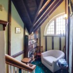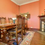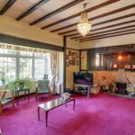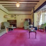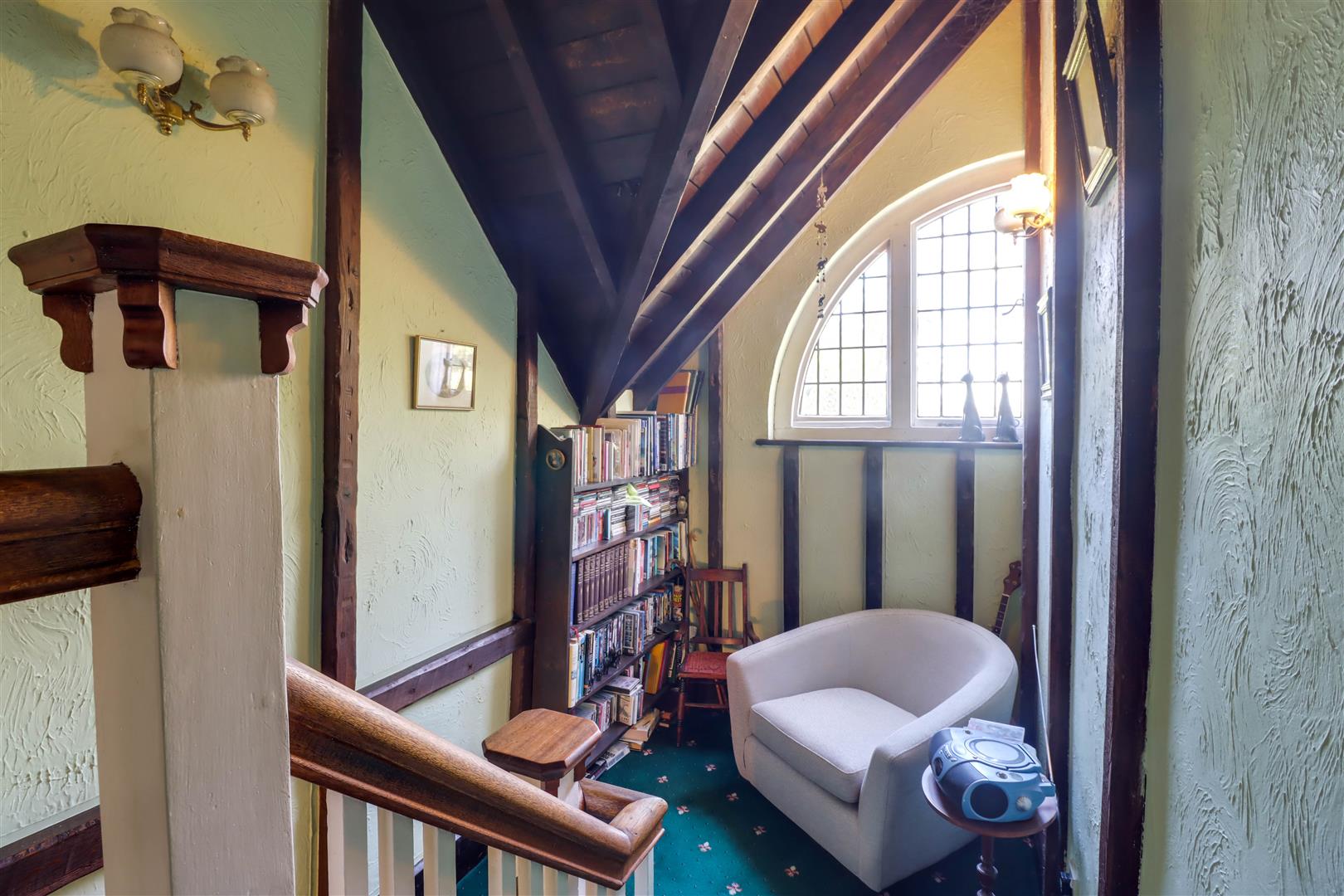 Window in square bay to rear, feature fire surround, stained glass windows, radiator, beams to high ceiling, radiator