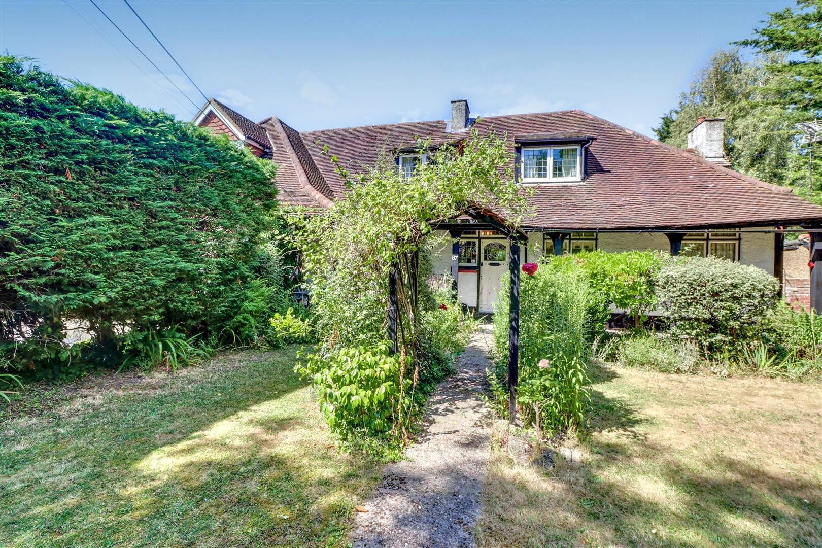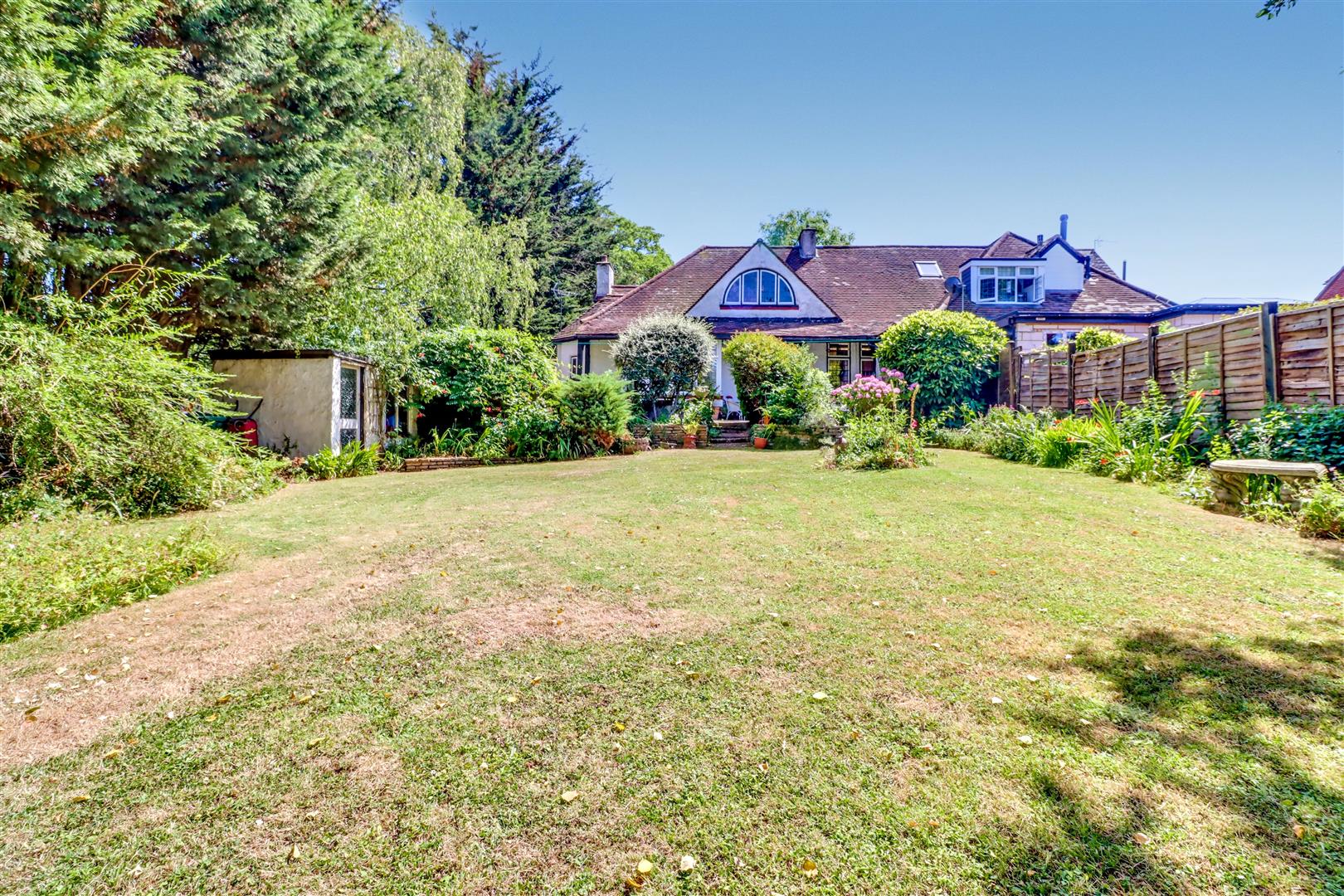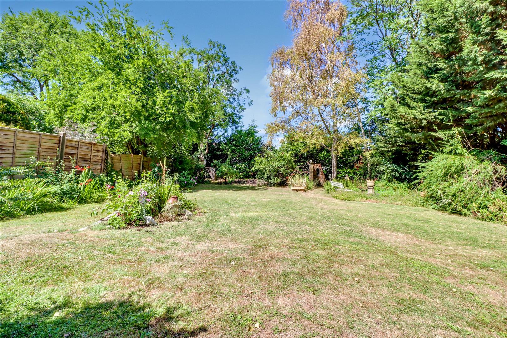 Patio to fore, mature flower and shrub borders fenced to all boundaries, side access to front, various mature flower beds and shrubs, air raid shelter, seating areas
