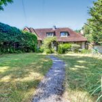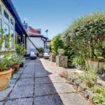 Driveway leading to garage, mature flower and shrub beds with access through to rear garden, path to front door