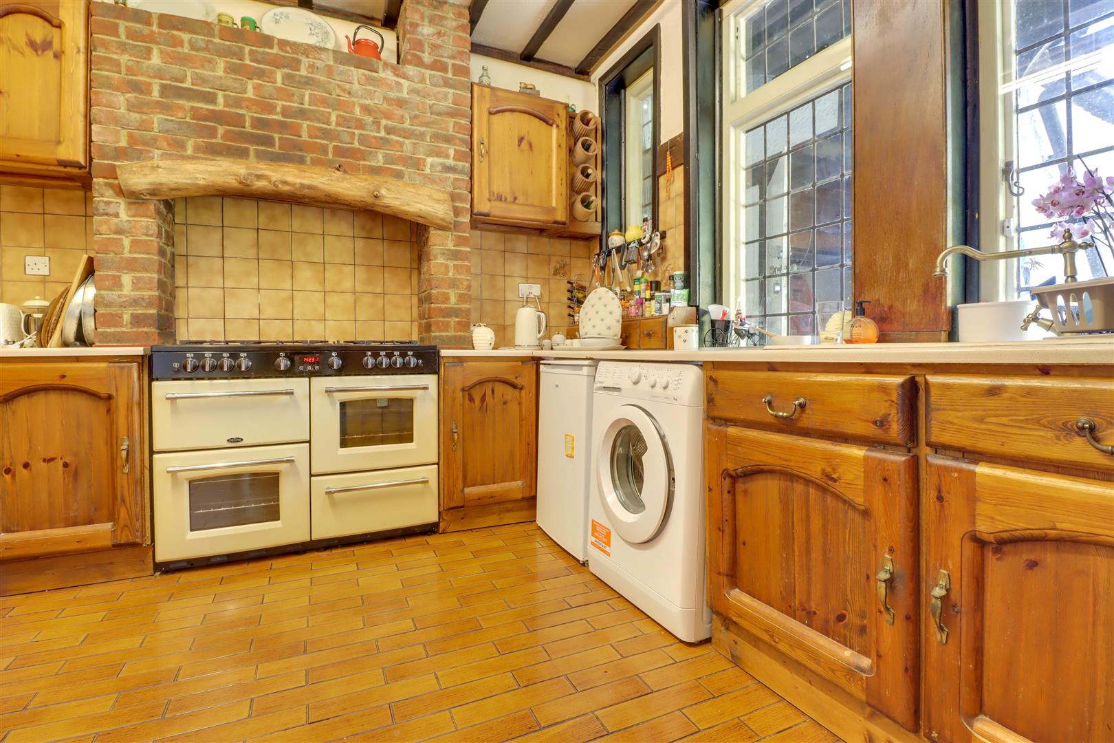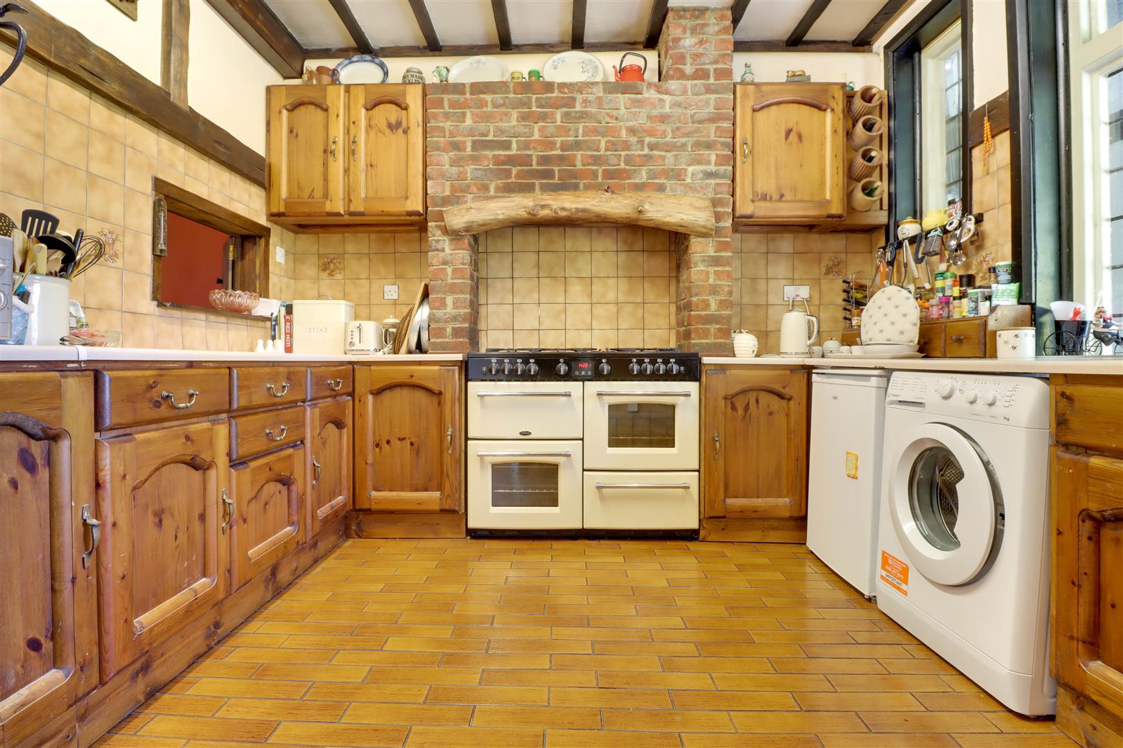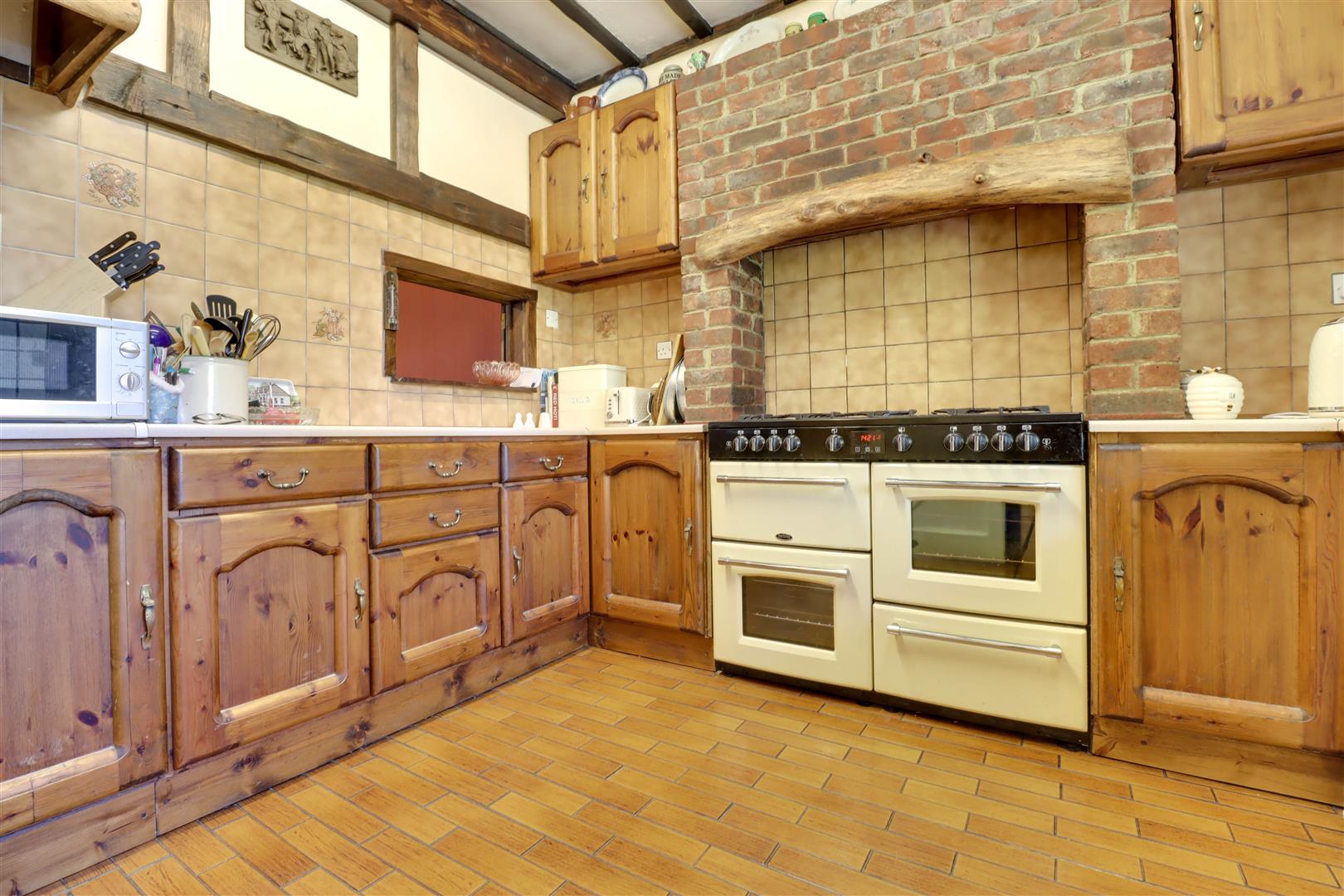 Window to rear, modern kitchen units to ground and eye level incorporating complimentary roll edged work surfaces, space for various kitchen appliances, range cooker with hood over, serving hatch to dining room, tiled splash backs and tiled floor