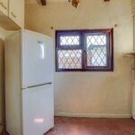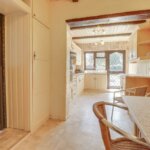 Double glazed window and door to garden. Range of base and wall units providing drawer and cupboard space. Additional built-in cupboards and shelving. Radiator. Radiator. Built-in oven and hob with extractor above. Worktops extending to incorporate sink unit.