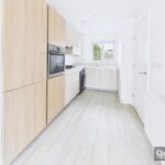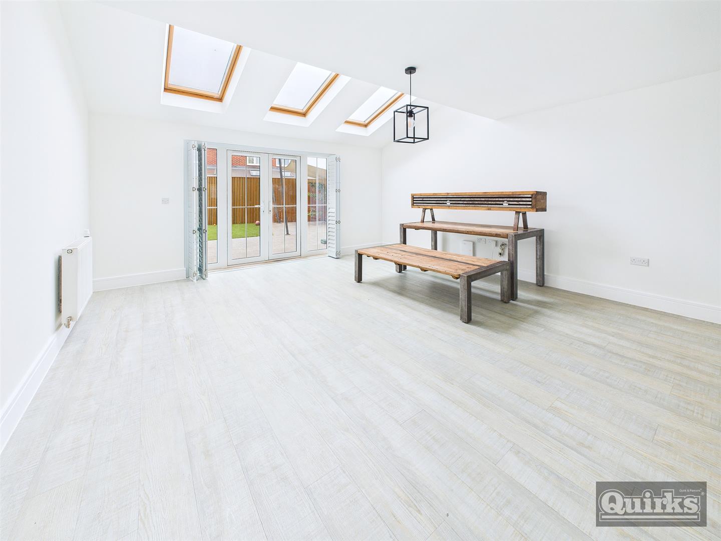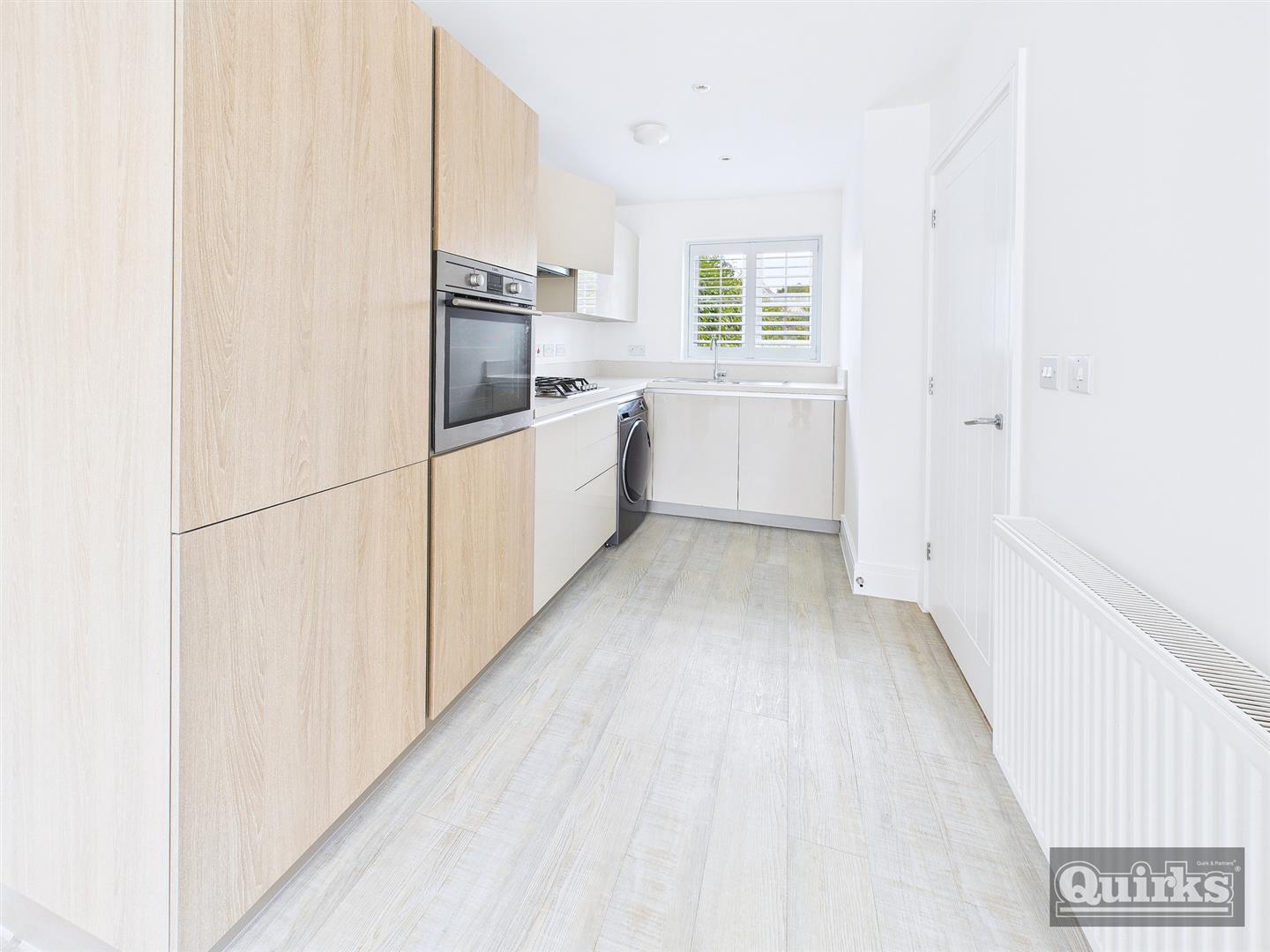 Double glazed window to flank and double glazed French doors to garden, Double glazed Velux style roof lights, radiator, Amtico style floor covering, access to under stair storage cupboard, Double glazed window to front, Amtico style floor covering, modern units to both ground and eye level incorporating complimentary roll edged working surfaces with inset sink unit unit with mixer tap, built in oven and hob with hood over, integrated fridge/freezer and dishwasher, space and plumbing for washing machine, tiled splash backs