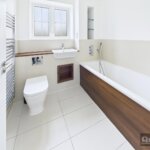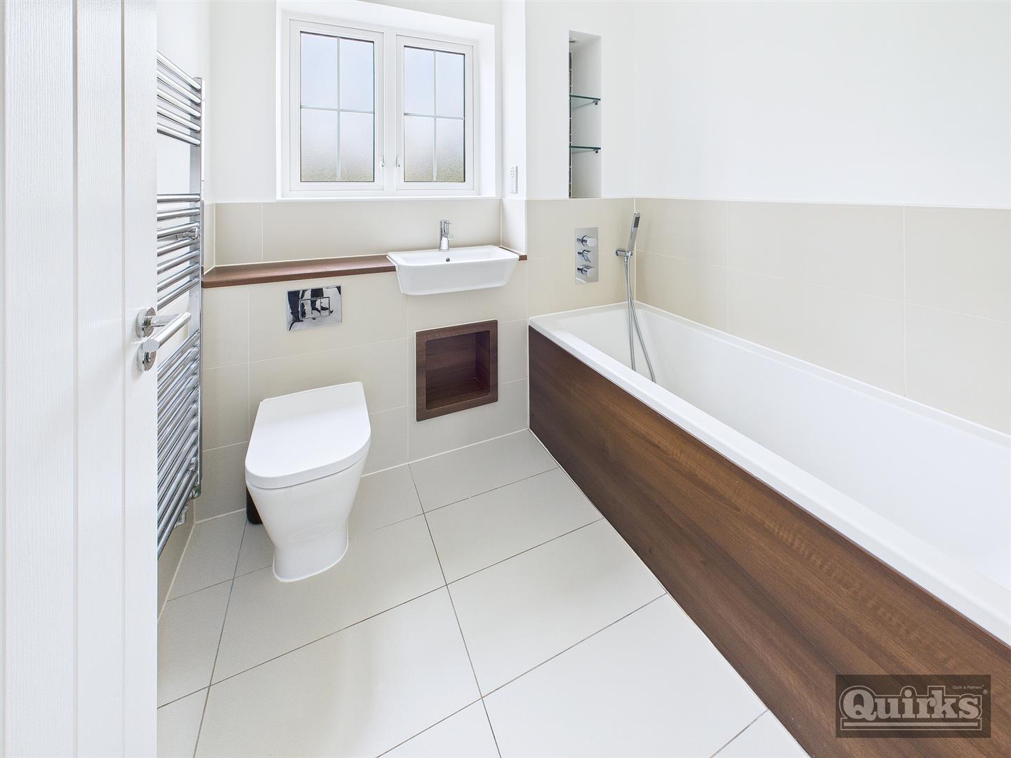 Double glazed window to front, pannelled bath with shower telephone attachment, wash hand basin inset to vanity unit, low flush wc, heated towel rail, tiling to floor