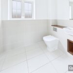 Large shower cubicle, wash hand basin inset to vanity unit, low flush wc, heated towel rail, tiling to floor