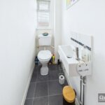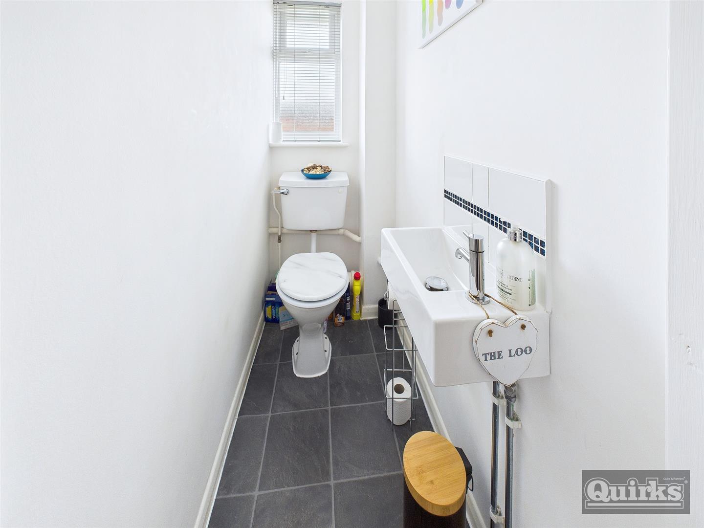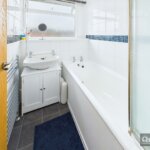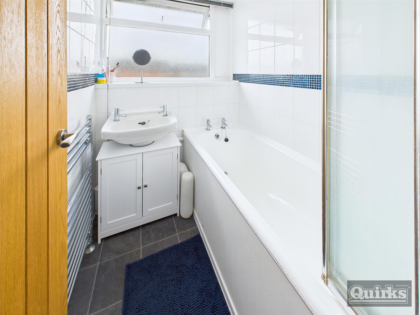 Double glazed window to rear, panelled bath with shower and screen, pedestal wash hand basin, heated towel rail, tiled walls and tiled floor, heated towel rail