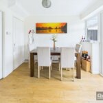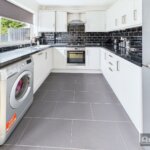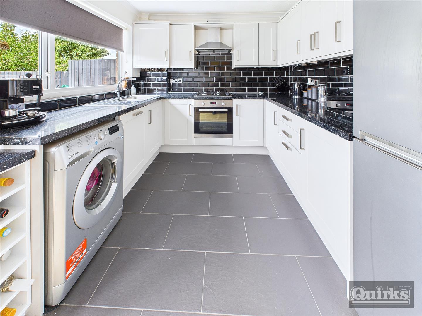 Double glazed window and double glazed French doors to garden, part tiled and part wood effect floor covering, range of units to ground and eye level, modern units to both ground and eye level, inset sink unit with drainer and mixer tap, space and plumbing for washing machine, integrated dishwasher, fitted hob and oven with hood over, ceramic tiled splash backs, recess for fridge/freezer, radiator, access to under stair cupboard