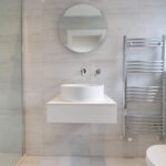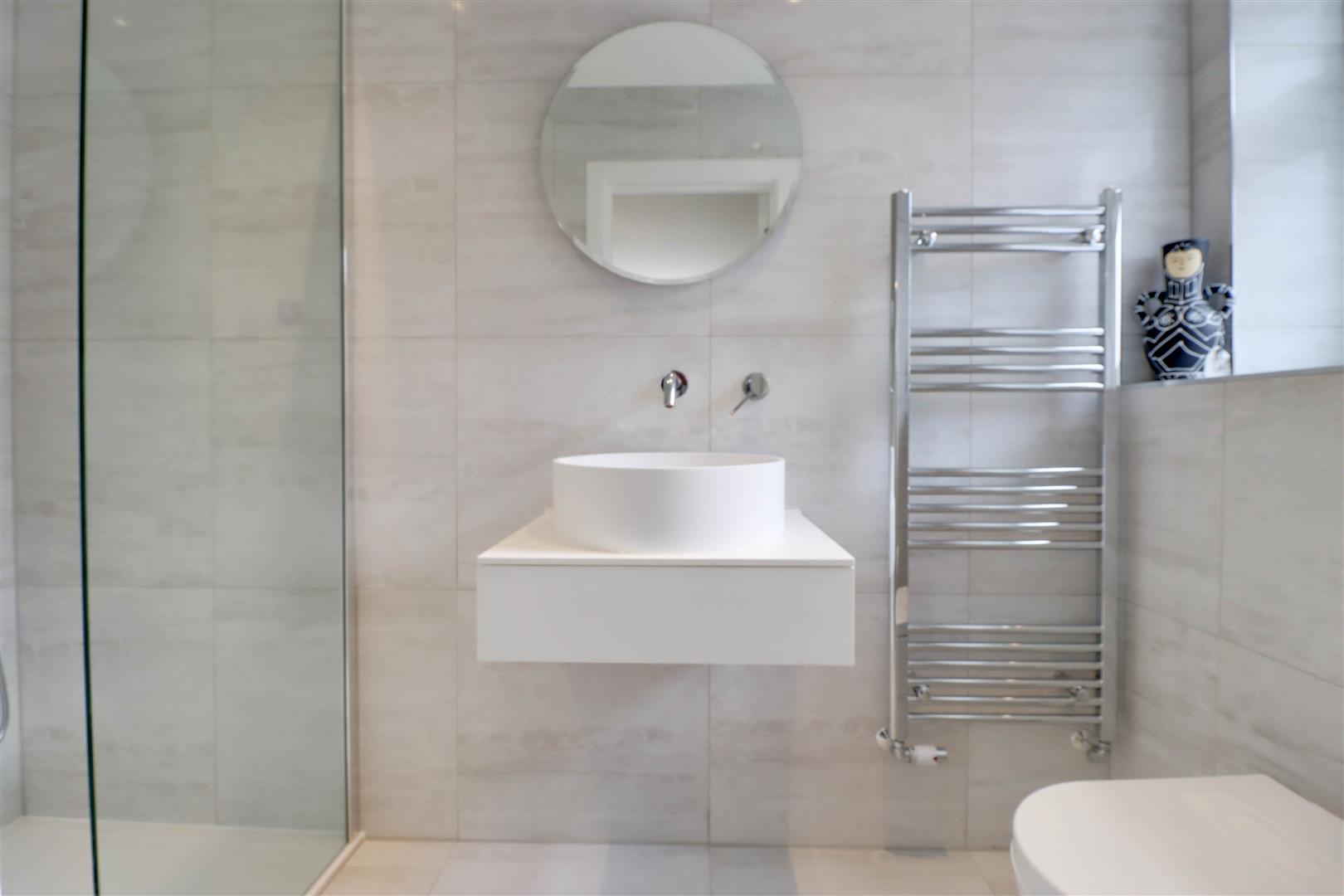 Double glazed window to flank, shower cubicle, concealed flush wc, wall mounted wash hand basin, shower cubicle, tiled floor and walls, illuminated mirror, heated towel rail