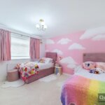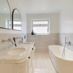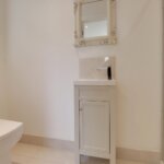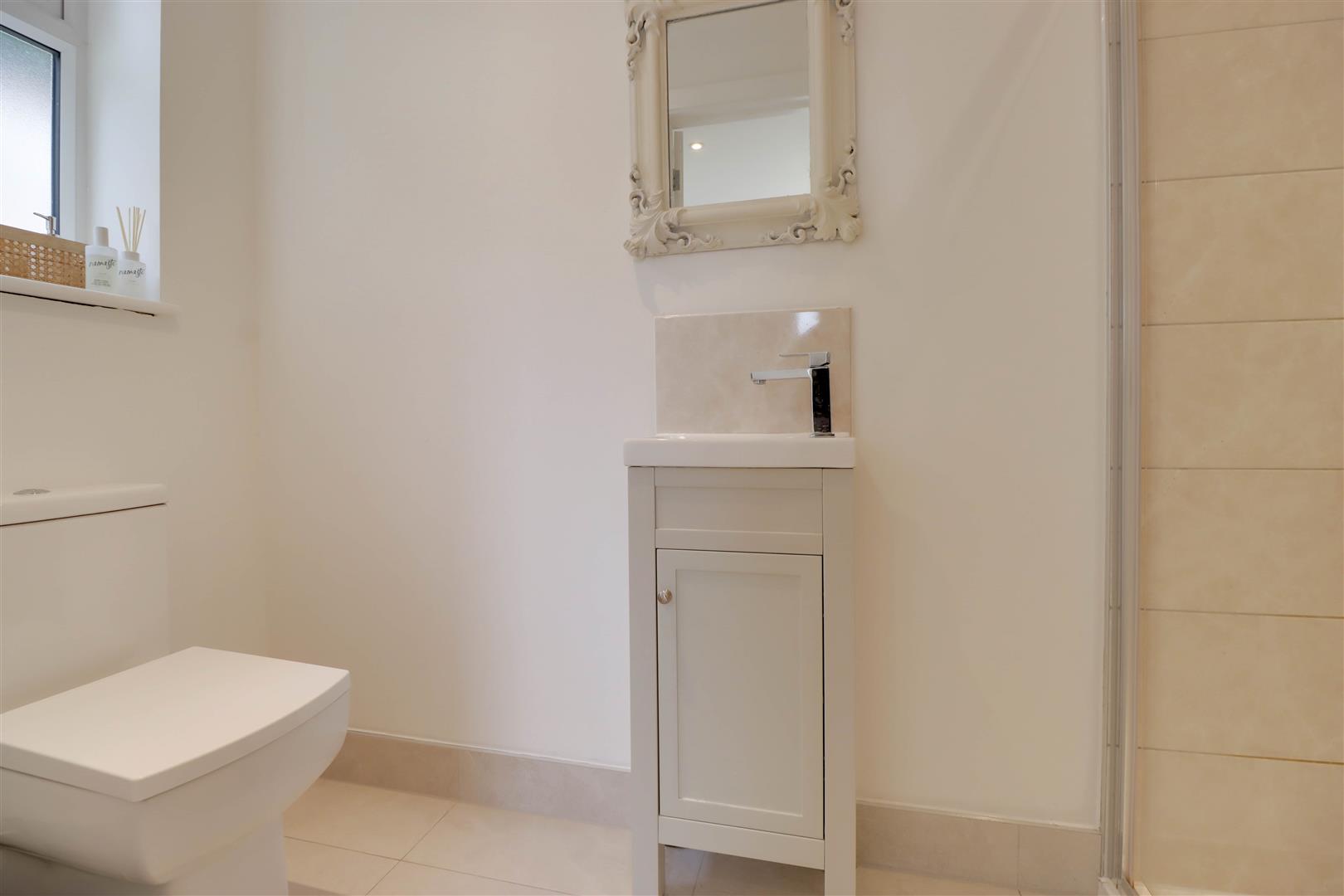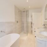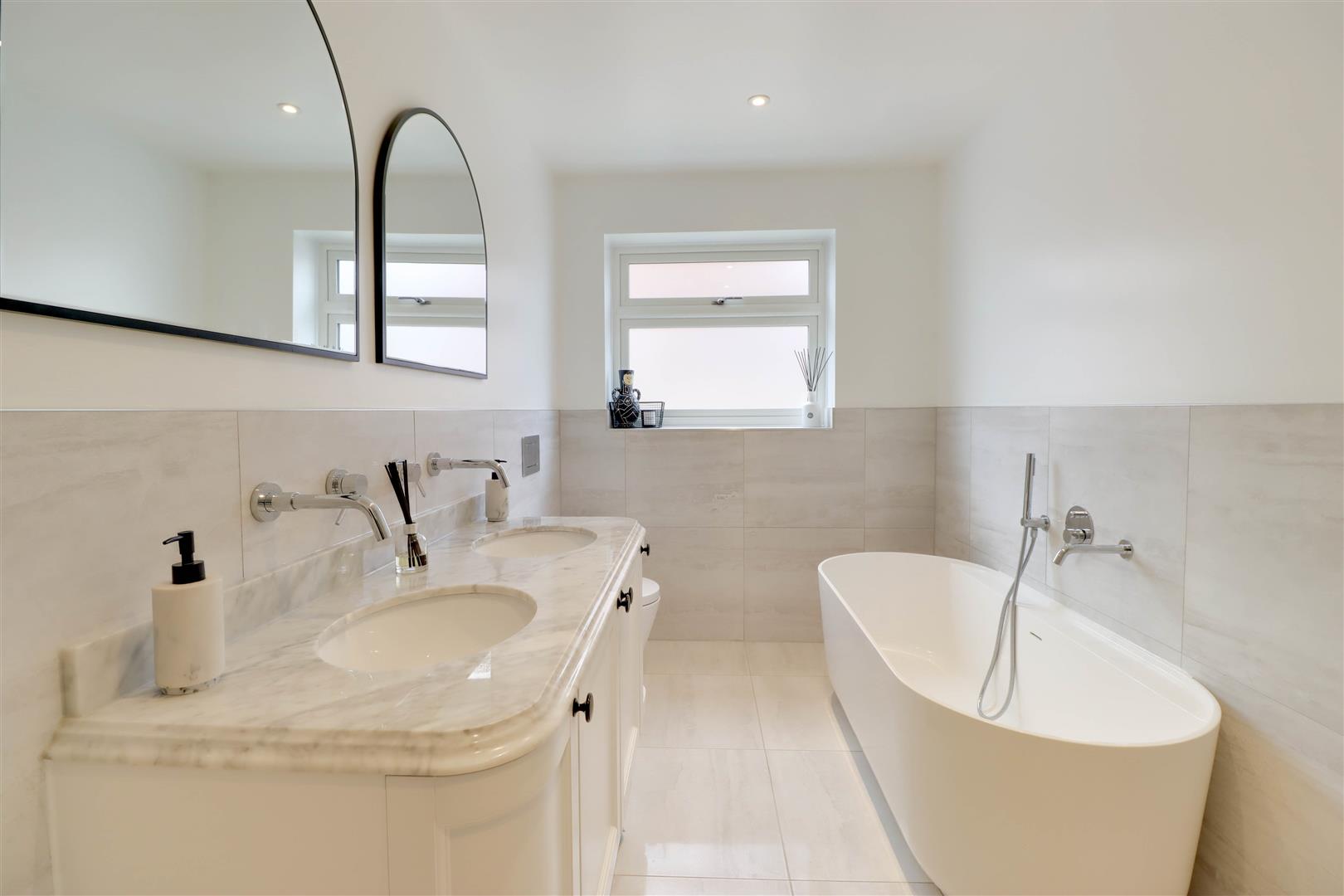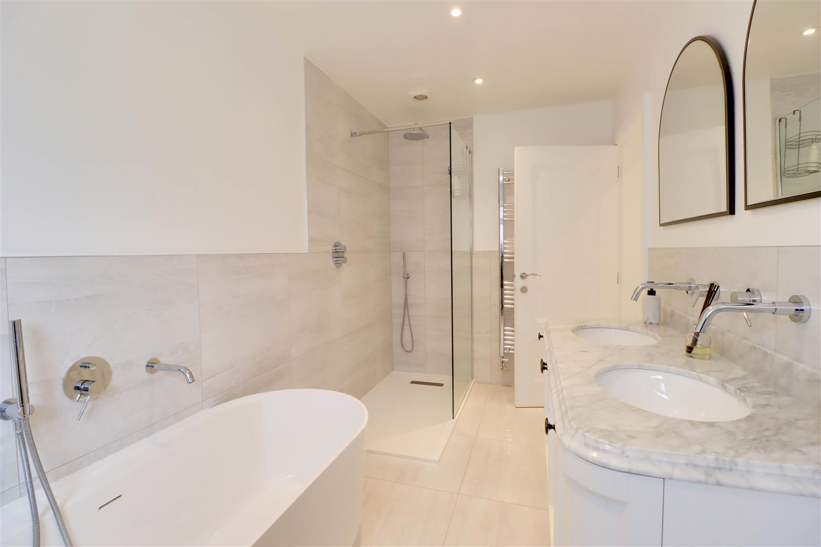 Double glazed window to flank, fully tiled, walk in shower cubicle, concealed flush wc, freestanding egg shaped bath, his and hers sinks inset to marble with vanity cupboard