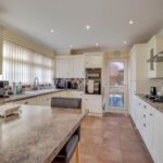 Double glazed half bay window and additional double glazed opaque window to front. Double glazed door to side. Range of base and wall mounted units providing drawer and cupboard space with work top surface extending to incorporate inset sink unit. Integrated dishwasher, washing machine, fridge and freezer. Built in oven, grill, hob and extractor fan above. Tiling to floor and surround. Glazed display cupboards. Coved ceiling. Cupboard housing combi boiler. Radiator. Breakfast bar.
