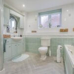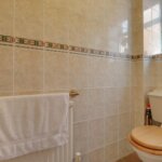Double glazed opaque window to side. Suite comprising of low level WC and vanity wash hand basin. Tiling to floor and walls. Radiator.