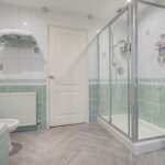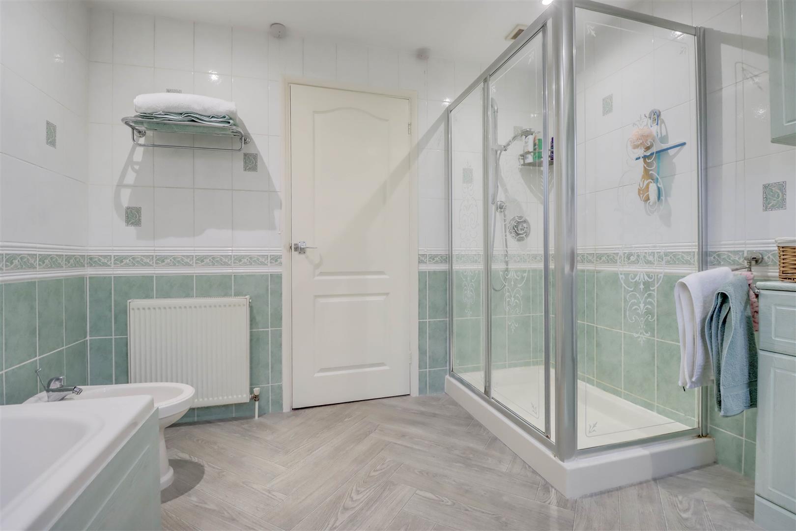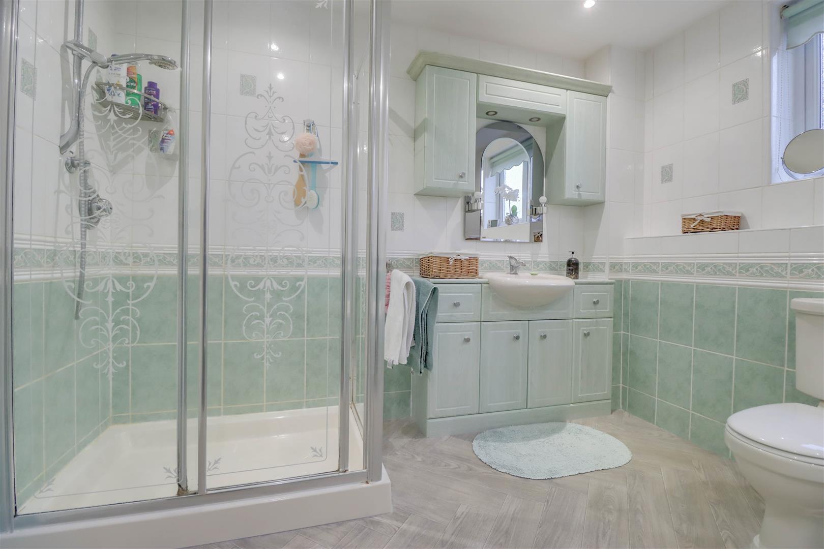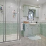 Double glazed opaque window to side. Suite comprising of low level WC, vanity wash hand basin, panel enclosed bath unit with shower. Lighted mirror. Extensive tiled surround. Radiator.