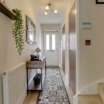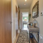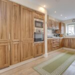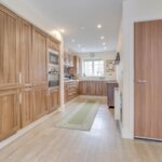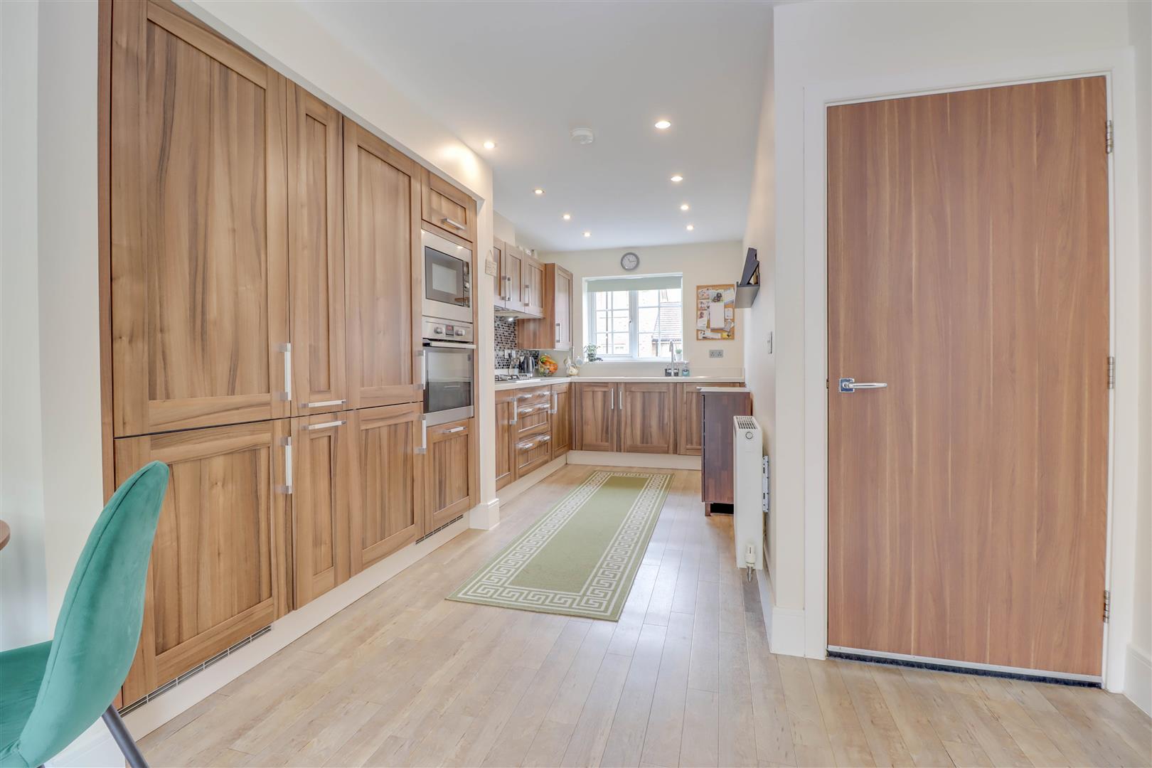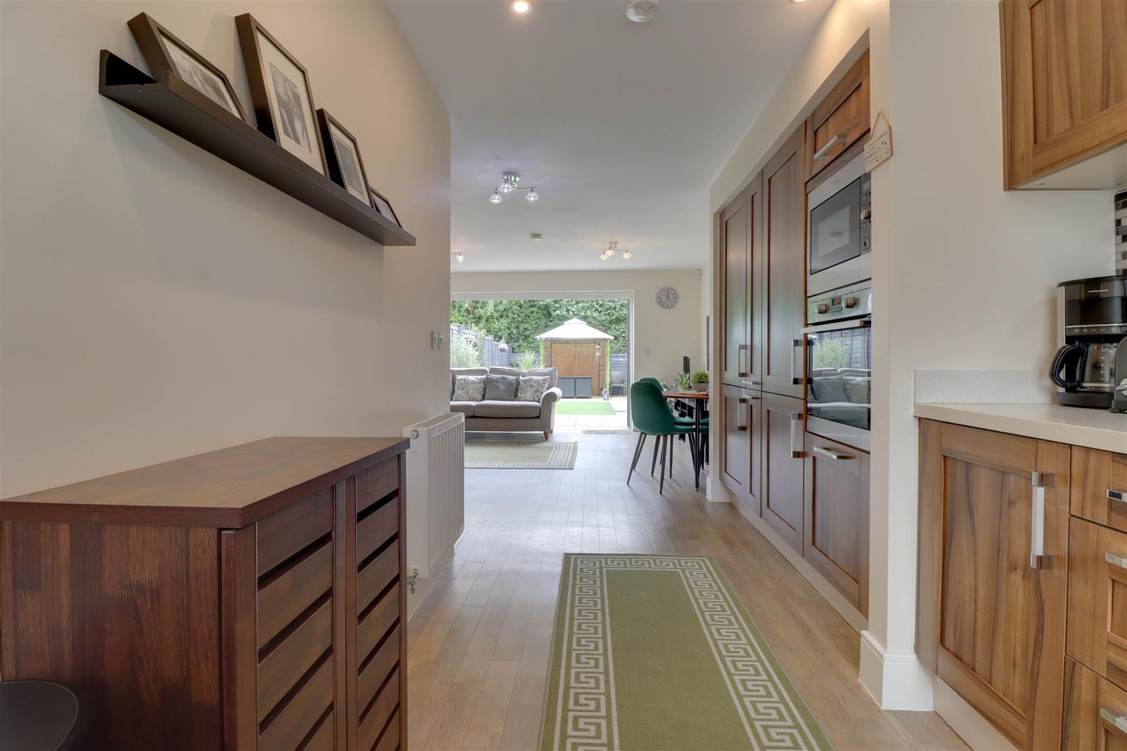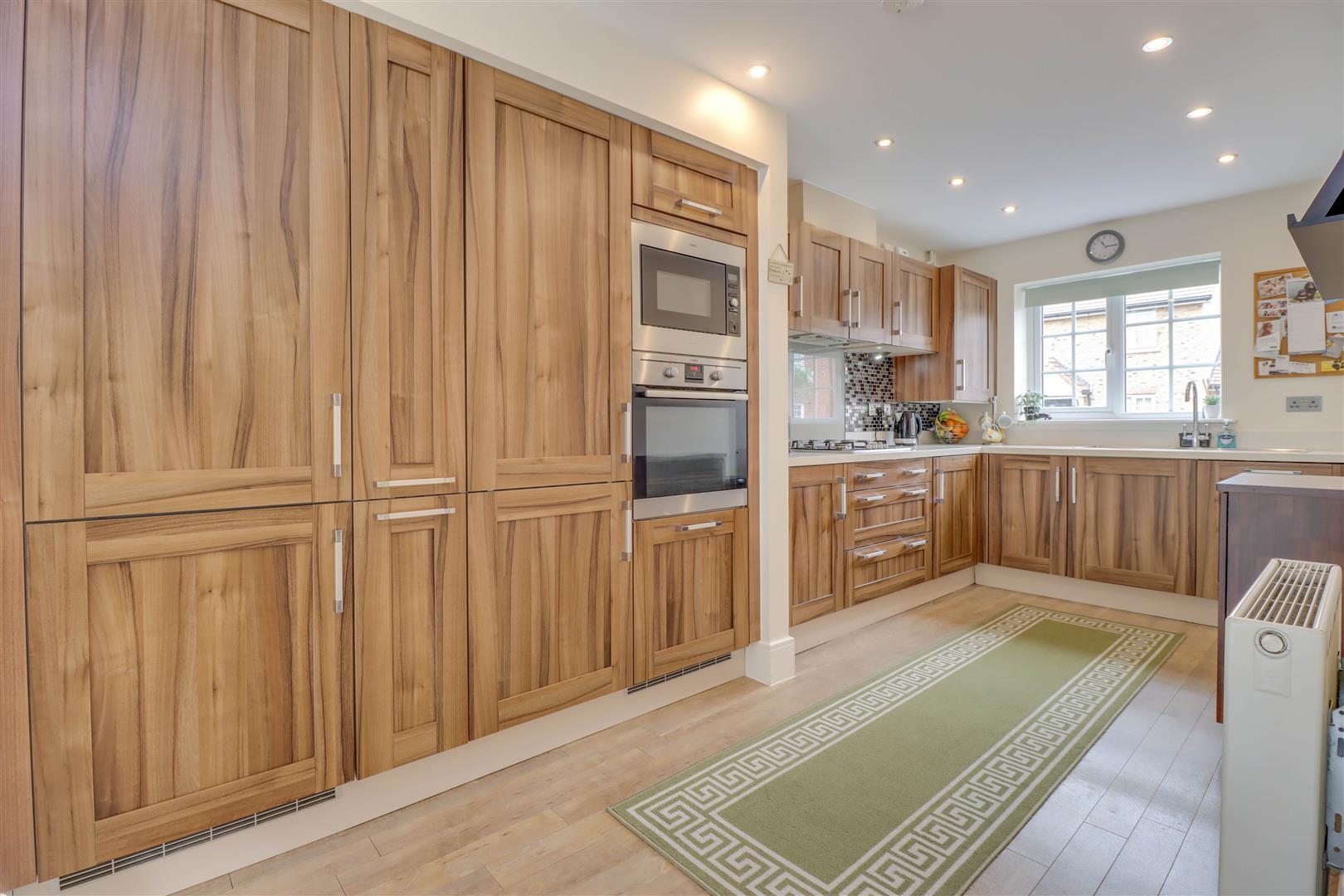 Double glazed window to front. Range of base and wall mounted units providing drawer and cupboard space with work top surface extending to incorporate inset sink unit with cupboard beneath. Upright storage cupboard. Pull out larder. Integrated dishwasher, washing machine and fridge freezer. Built in oven, microwave, hob and extractor fan above. Cupboard housing boiler. Tiled surround.