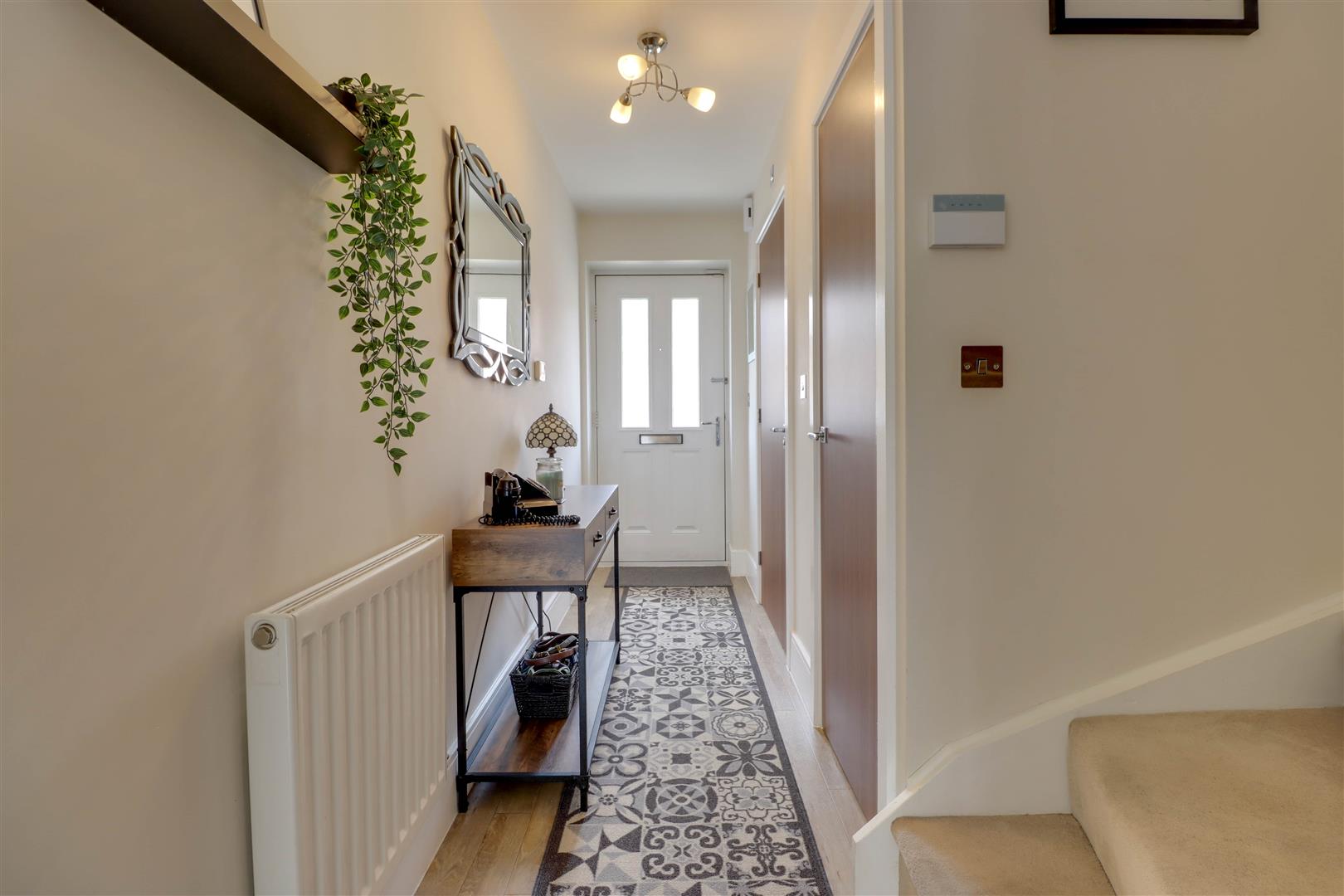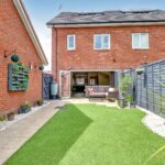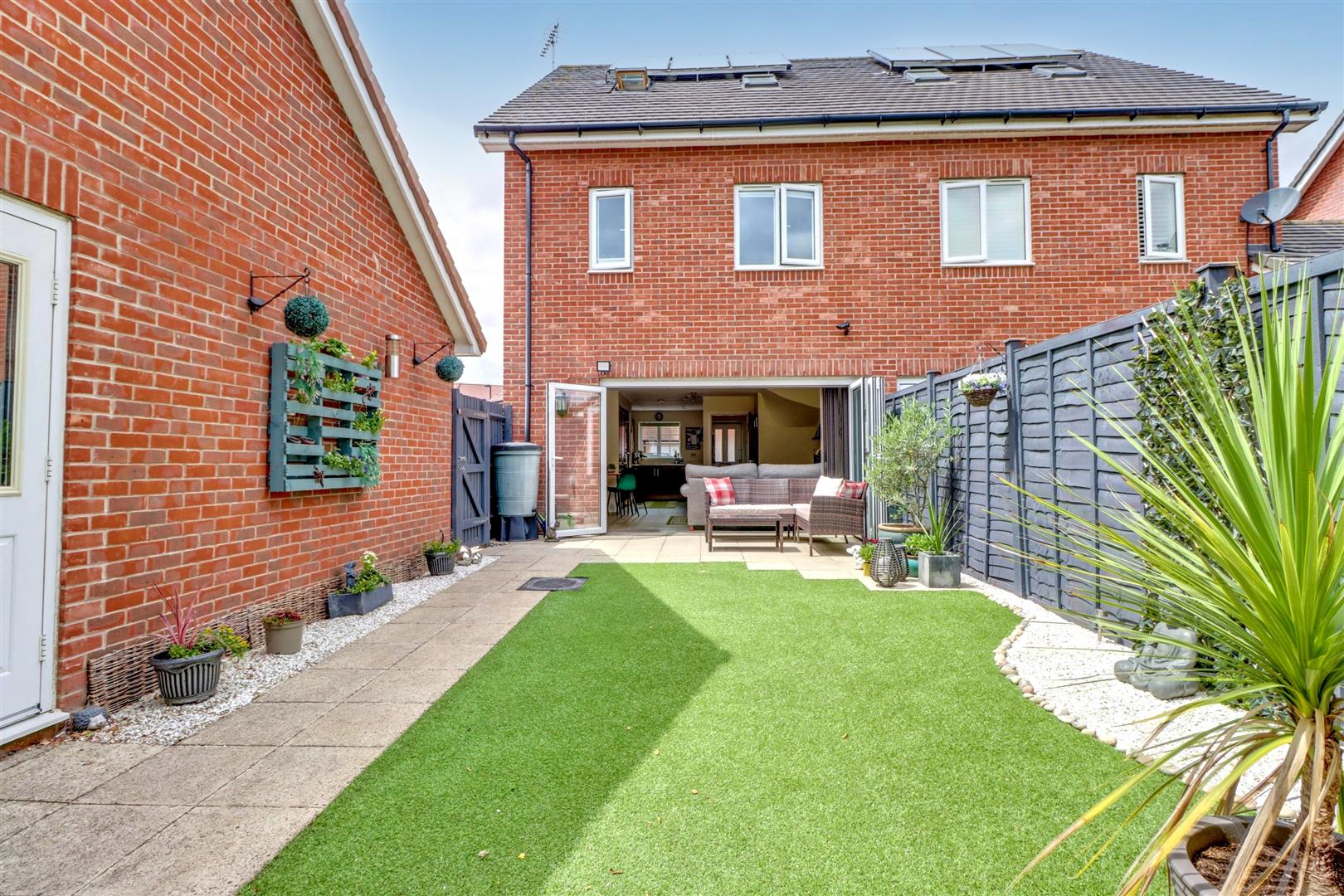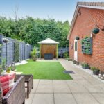 Commencing with paved patio to immediate rear with remainder laid to artificial lawn with path to additional patio area. Outside tap, power points and lights. Gate to side. Courtesy door to:
